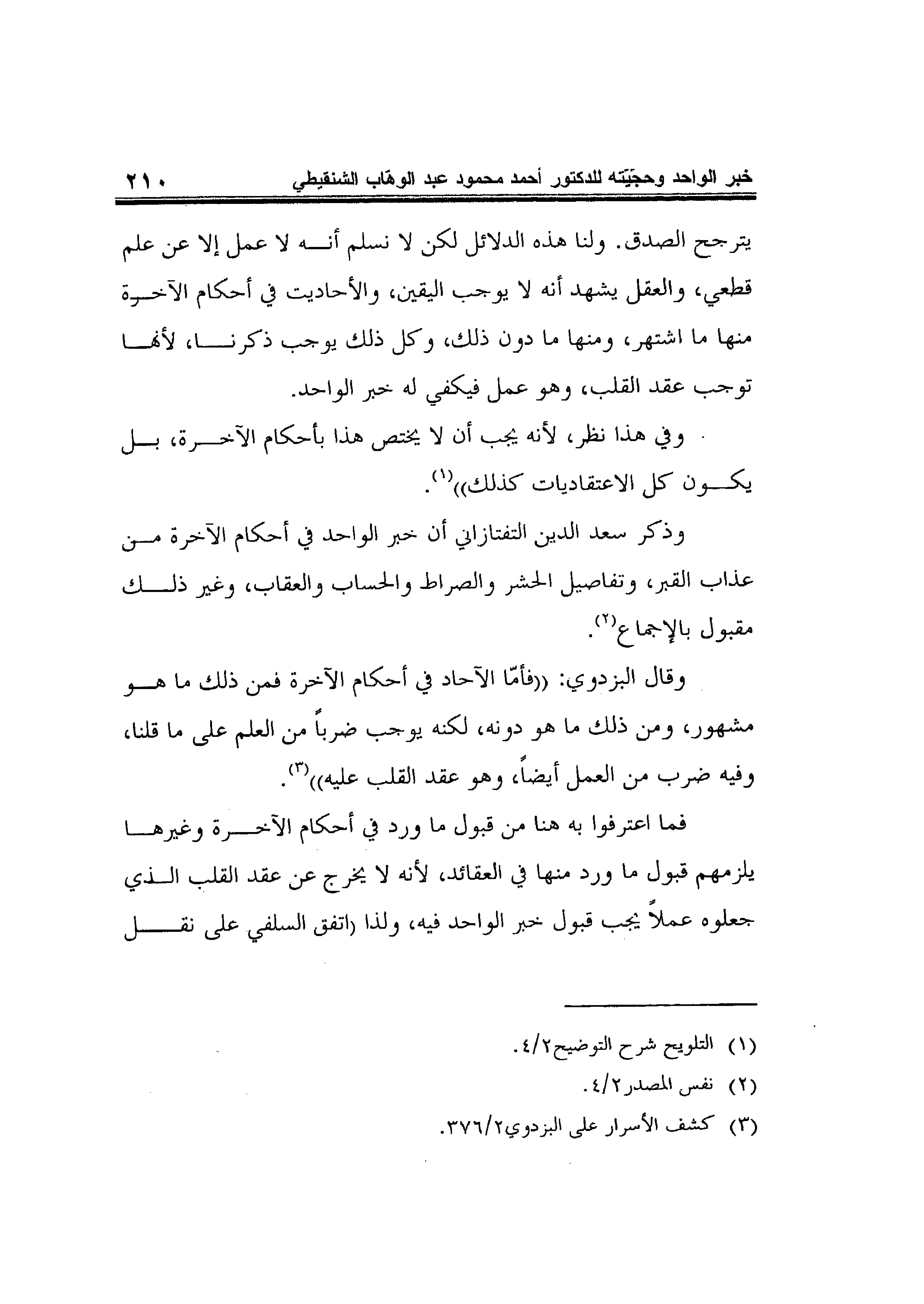 وقال البزدوي: "فأمّا الآحاد في أحكام الآخرة فمن ذلك ما هو مشهور، ومن ذلك ما هو دونه، لكنه يوجب ضرباً من العلم على ما قلنا، وفيه ضرب من العمل أيضاً، وهو عقد القلب عليه"3.
