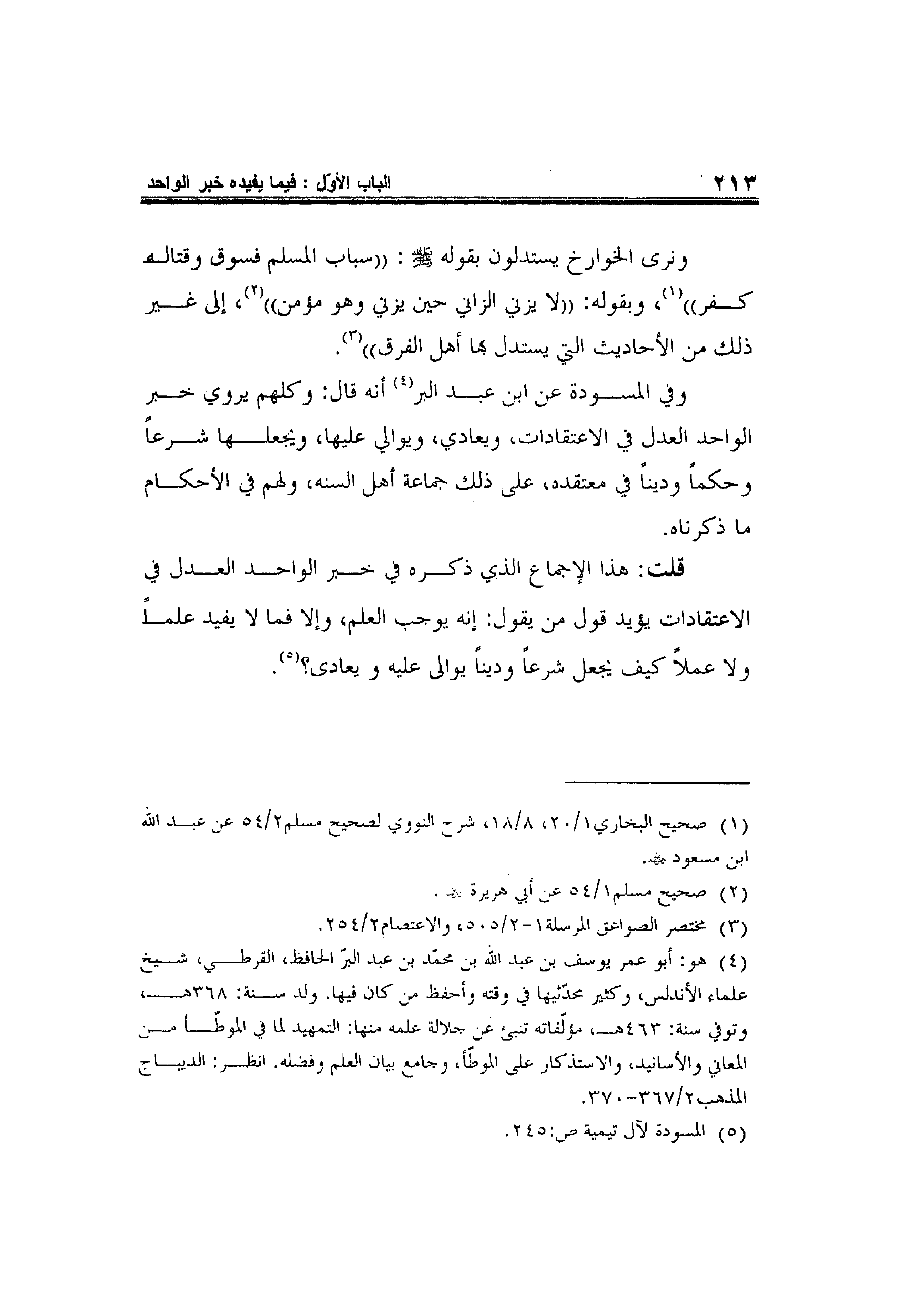 قلت: هذا الإجماع الذي ذكره في خبر الواحد العدل في الاعتقادات يؤيد قول من يقول: إنه يوجب العلم، وإلا فما لا يفيد علماً ولا عملاً كيف يجعل شرعاً وديناً يوالى عليه ويعادى؟ 5.