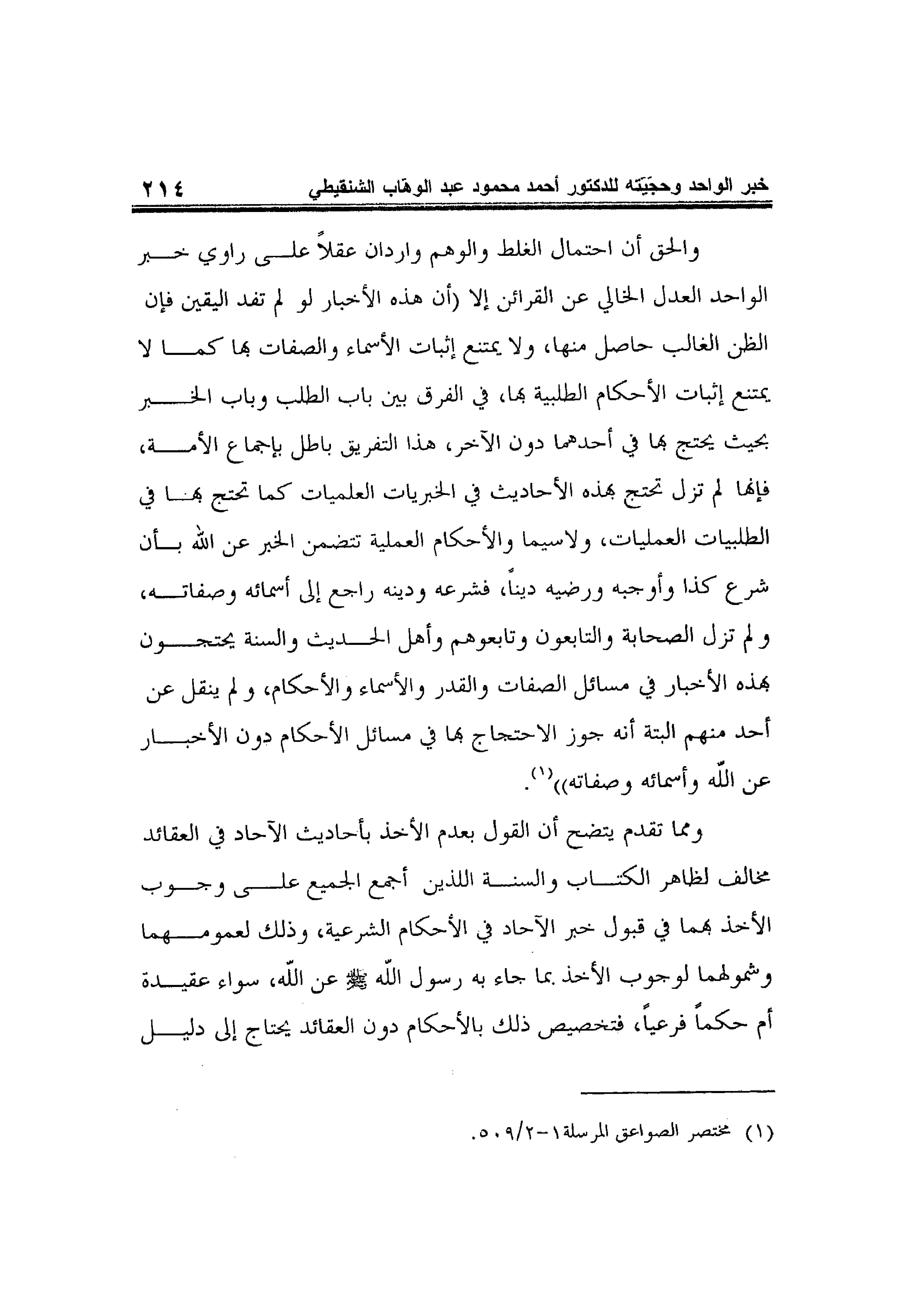 والحق أن احتمال الغلط والوهم واردان عقلاً على راوي خبر الواحد العدل الخالي عن القرائن إلا أن هذه الأخبار لو لم تفد اليقين فإن الظن الغالب حاصل منها، ولا يمتنع إثبات الأسماء والصفات بها كما لا يمتنع إثبات الأحكام الطلبية بها، في الفرق بين باب الطلب وباب الخبر بحيث يحتج بها في أحدهما دون الآخر، هذا التفريق باطل بإجماع الأمة، فإنها لم تزل تحتج بهذه الأحاديث في الخبريات العلميات كما تحتج بها في الطلبيات العمليات، ولاسيما والأحكام العملية تتضمن الخبر عن الله بأن شرع كذا وأوجبه ورضيه ديناً، فشرعه ودينه راجع إلى أسمائه وصفاته، ولم تزل الصحابة والتابعون وتابعوهم وأهل الحديث والسنة يحتجون بهذه الأخبار في مسائل الصفات والقدر والأسماء والأحكام، ولم ينقل عن أحد منهم البتة أنه جوز الاحتجاج بها في مسائل الأحكام دون الأخبار عن الله وأسمائه وصفاته"1.
