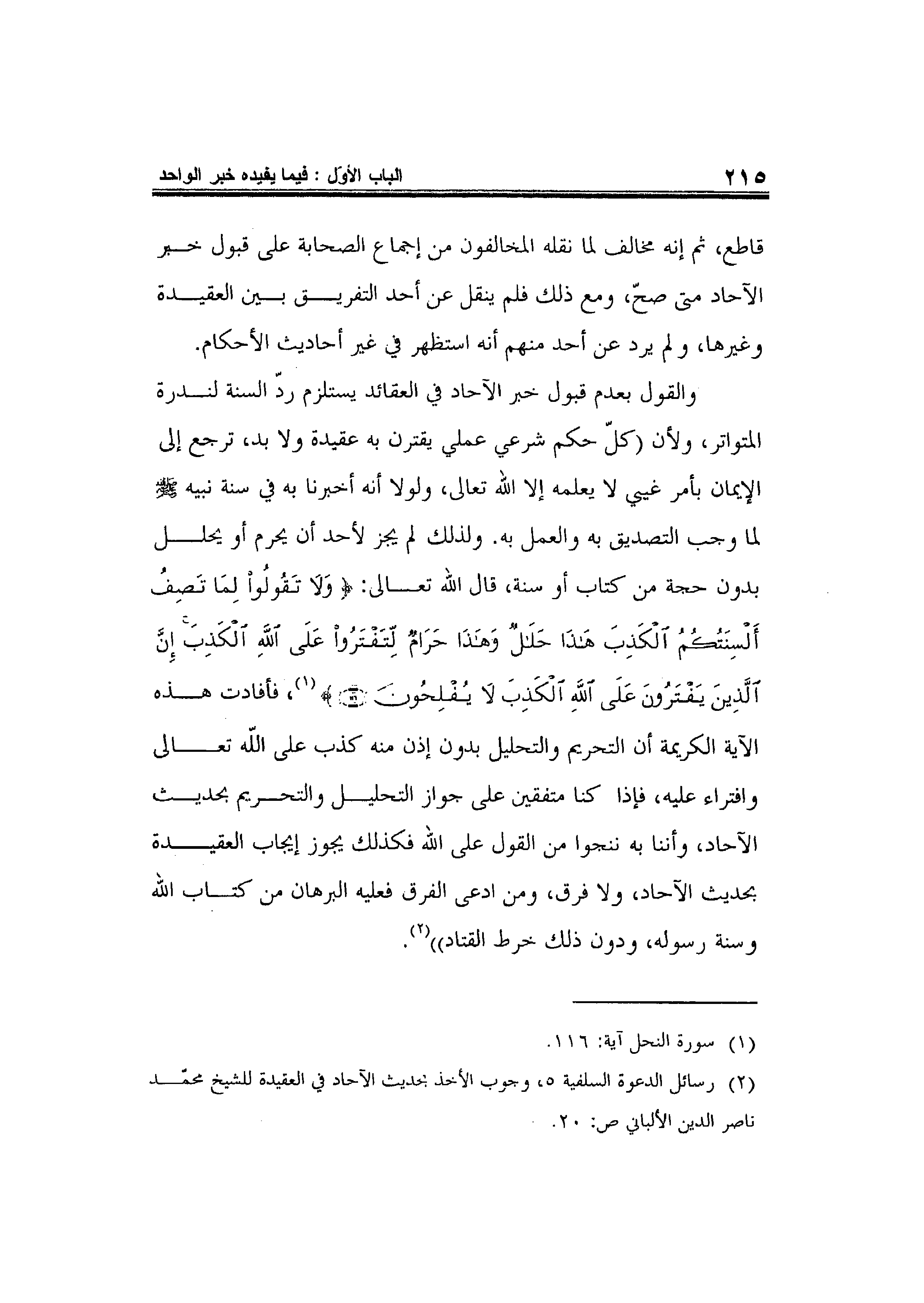 2 رسائل الدعوة السلفية 5، وجوب الأخذ بحديث الآحاد في العقيدة للشيخ محمّد ناصر الدين الألباني ص: 20.