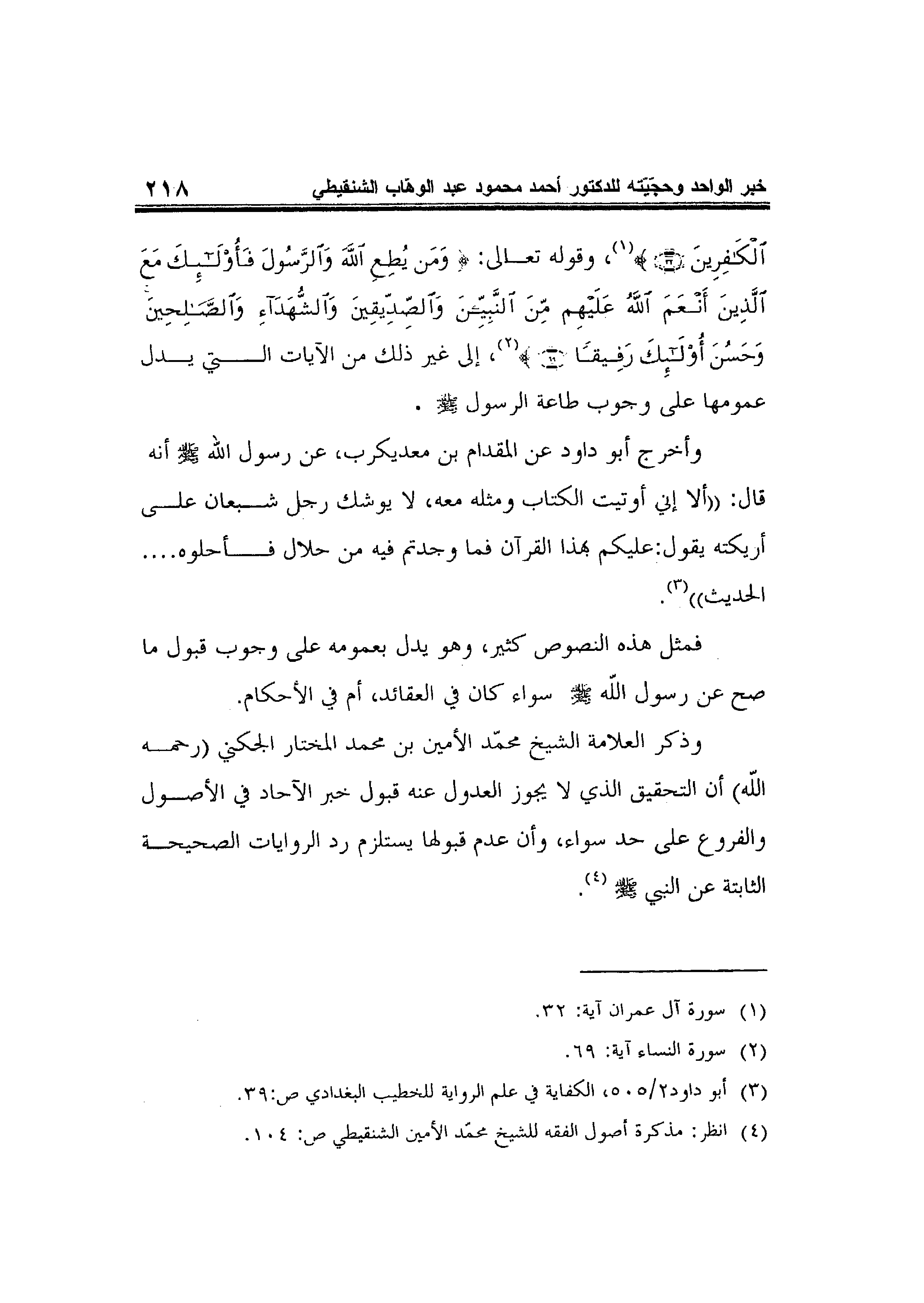 وذكر العلامة الشيخ محمّد الأمين بن محمد المختار الجكني -رحمه الله- أن التحقيق الذي لا يجوز العدول عنه قبول خبر الآحاد في الأصول والفروع على حد سواء، وأن عدم قبولها يستلزم رد الروايات الصحيحة الثابتة عن النبي صلى الله عليه وسلم 3.