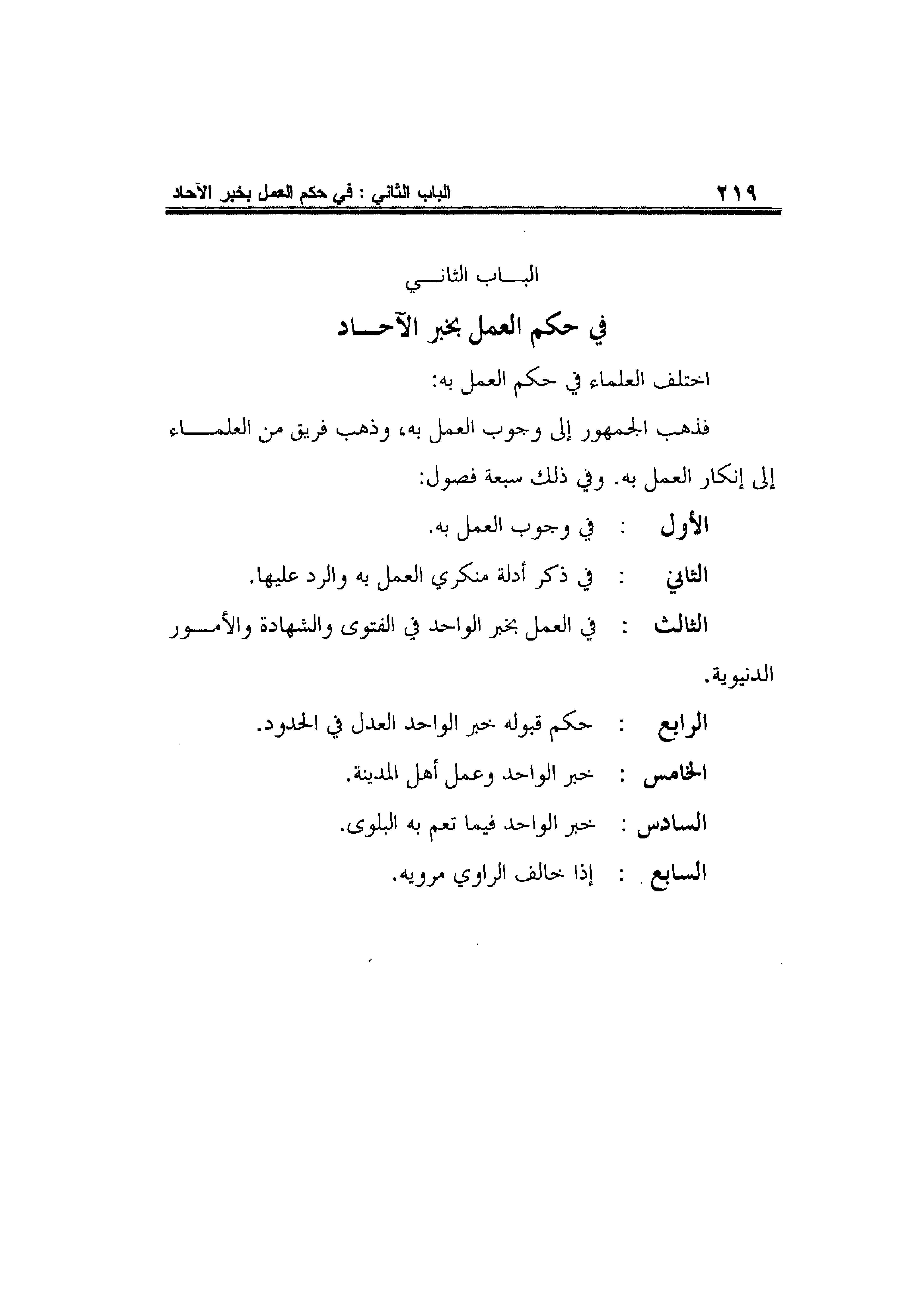 الباب الثاني: في حكم العمل بخير الآحاد