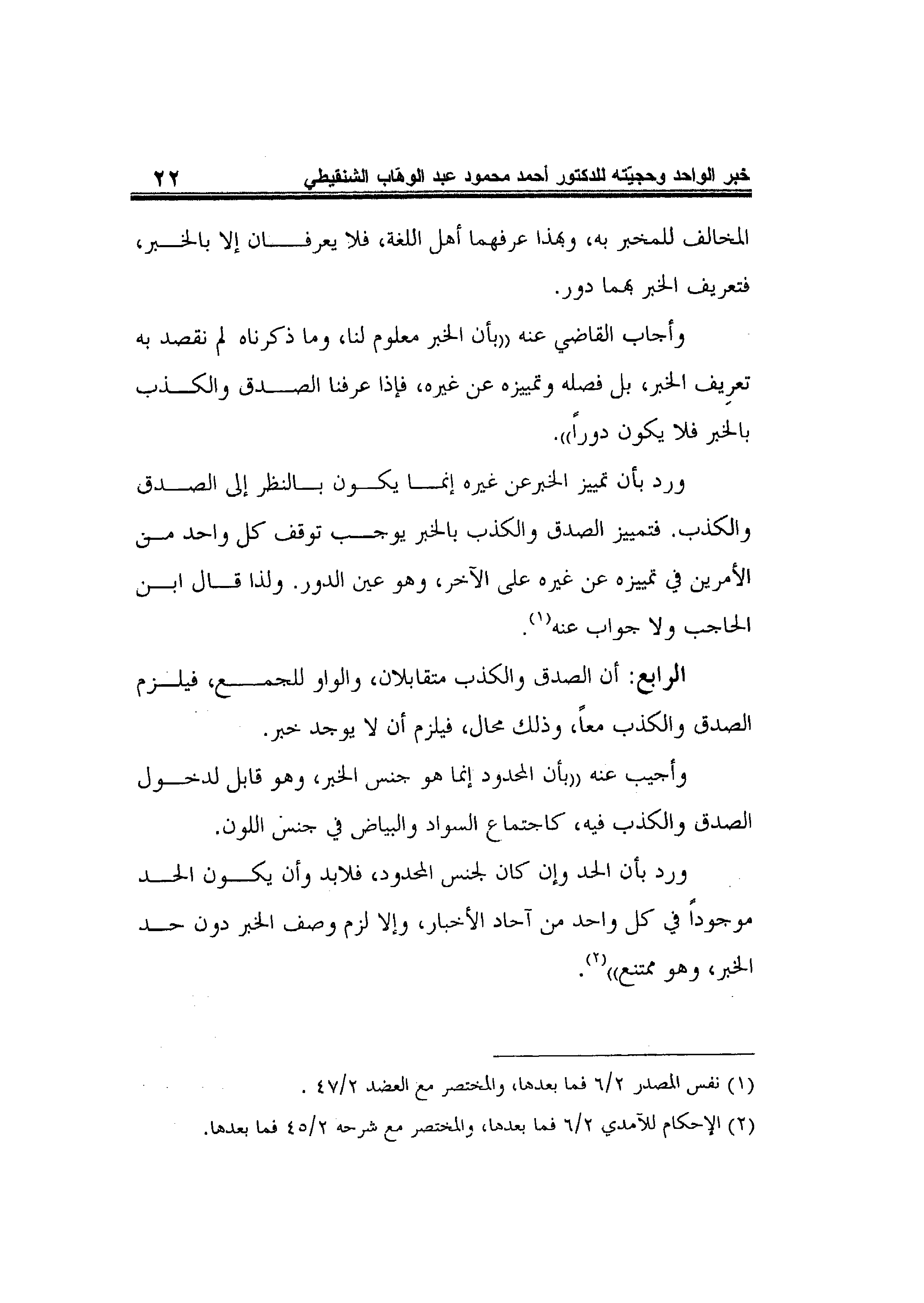ورد بأن تمييز الخبر عن غيره إنما يكون بالنظر إلى الصدق والكذب. فتمييز الصدق والكذب بالخبر يوجب توقف كل واحد من الأمرين في تمييزه عن غيره على الآخر، وهو عين الدور. ولذا قال ابن الحاجب ولا جواب عنه1.