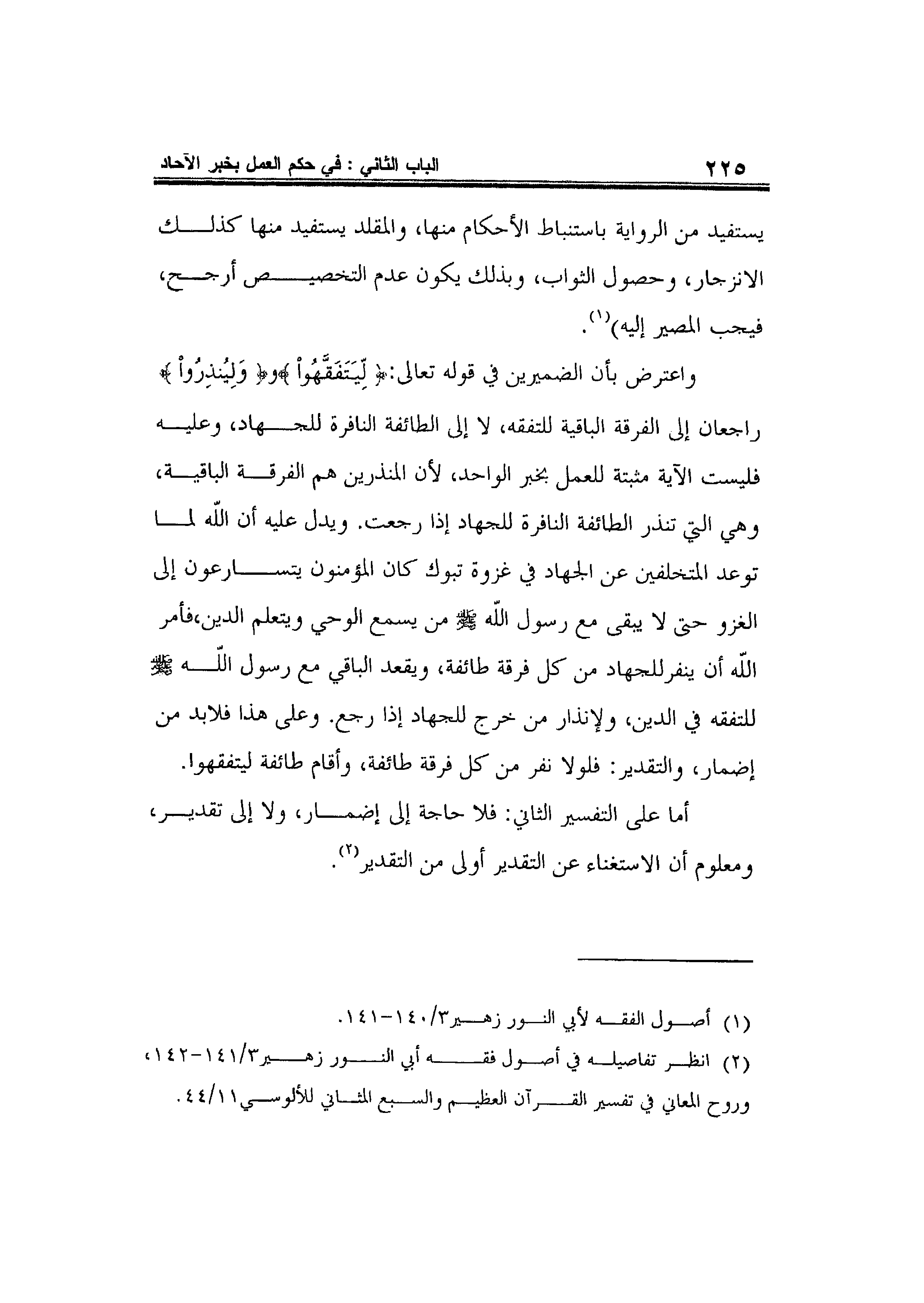 واعترض بأن الضميرين في قوله تعالى: {لِيَتَفَقَّهُوا} و {وَلِيُنْذِرُوا} راجعان إلى الفرقة الباقية للتفقه، لا إلى الطائفة النافرة للجهاد، وعليه فليست الآية مثبتة للعمل بخبر الواحد، لأن المنذرين هم الفرقة الباقية، وهي التي تنذر الطائفة النافرة للجهاد إذا رجعت. ويدل عليه أن الله لما توعد المتخلفين عن الجهاد في غزوة تبوك كان المؤمنون يتسارعون إلى الغزو حتى لا يبقى مع رسول اللهصلى الله عليه وسلم من يسمع الوحي ويتعلم الدين، فأمر الله أن ينفرللجهاد من كل فرقة طائفة، ويقعد الباقي مع رسول الله صلى الله عليه وسلم للتفقه في الدين، ولإنذار من خرج للجهاد إذا رجع. وعلى هذا فلابد من إضمار، والتقدير: فلولا نفر من كل فرقة طائفة، وأقام طائفة ليتفقهوا. أما على التفسير الثاني: فلا حاجة إلى إضمار، ولا إلى تقدير، ومعلوم أن الاستغناء عن التقدير أولى من التقدير2.