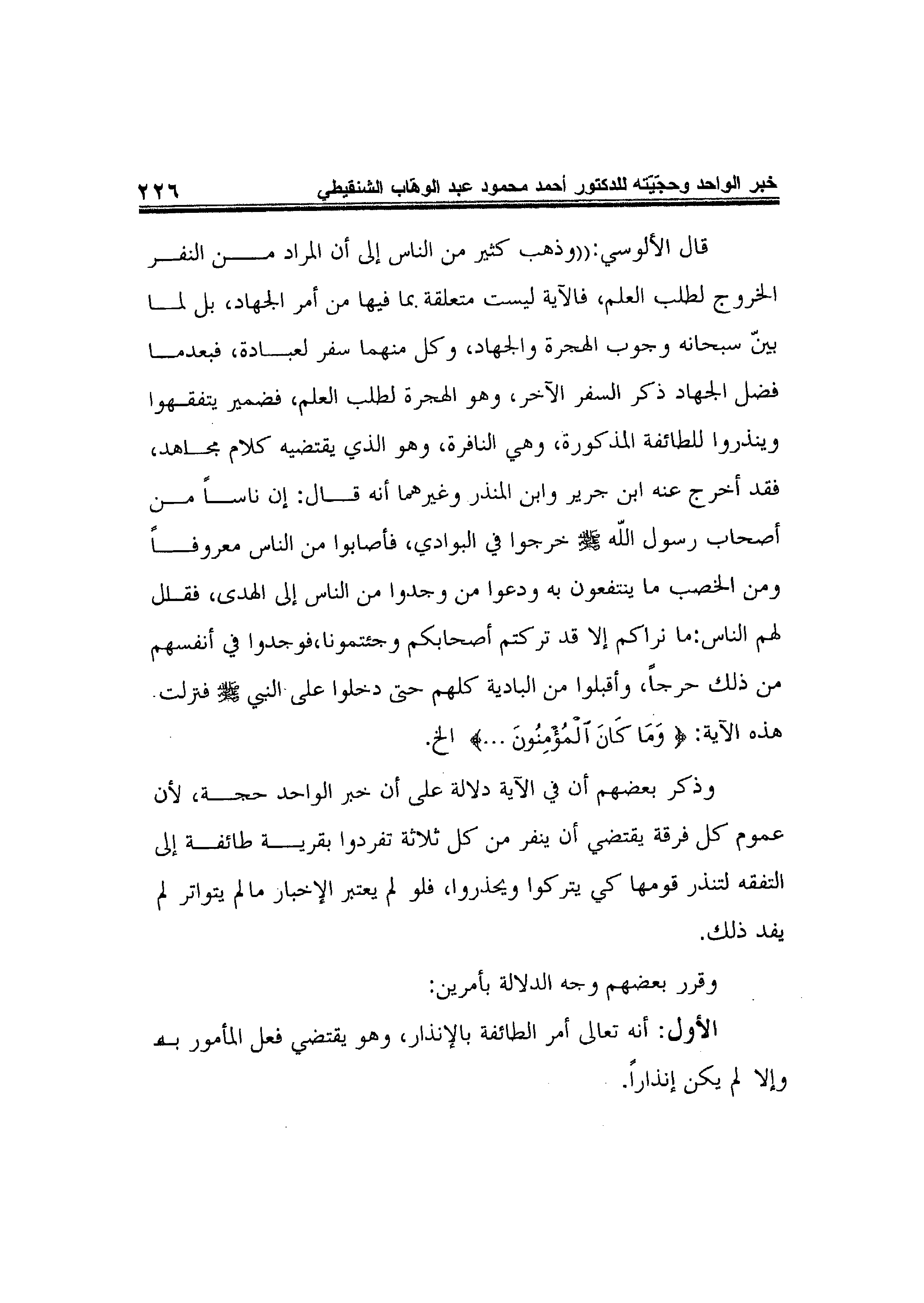 قال الألوسي: "وذهب كثير من الناس إلى أن المراد من النفر الخروج لطلب العلم، فالآية ليست متعلقة بما فيها من أمر الجهاد، بل لما بينّ سبحانه وجوب الهجرة والجهاد، وكل منهما سفر لعبادة، فبعدما فضل الجهاد ذكر السفر الآخر، وهو الهجرة لطلب العلم، فضمير يتفقهوا وينذروا للطائفة المذكورة، وهي النافرة، وهو الذي يقتضيه كلام مجاهد، فقد أخرج عنه ابن جرير وابن المنذر وغيرهما أنه قال: إن ناساً من أصحاب رسول الله صلى الله عليه وسلم خرجوا في البوادي، فأصابوا من الناس معروفاً ومن الخصب ما ينتفعون به ودعوا من وجدوا من الناس إلى الهدى، فقال لهم الناس: ما نراكم إلا قد تركتم أصحابكم وجئتمونا، فوجدوا في أنفسهم من ذلك حرجاً، وأقبلوا من البادية كلهم حتى دخلوا على النبيصلى الله عليه وسلم فنزلت هذه الآية: {وَمَا كَانَ الْمُؤْمِنُونَ ... } الخ.