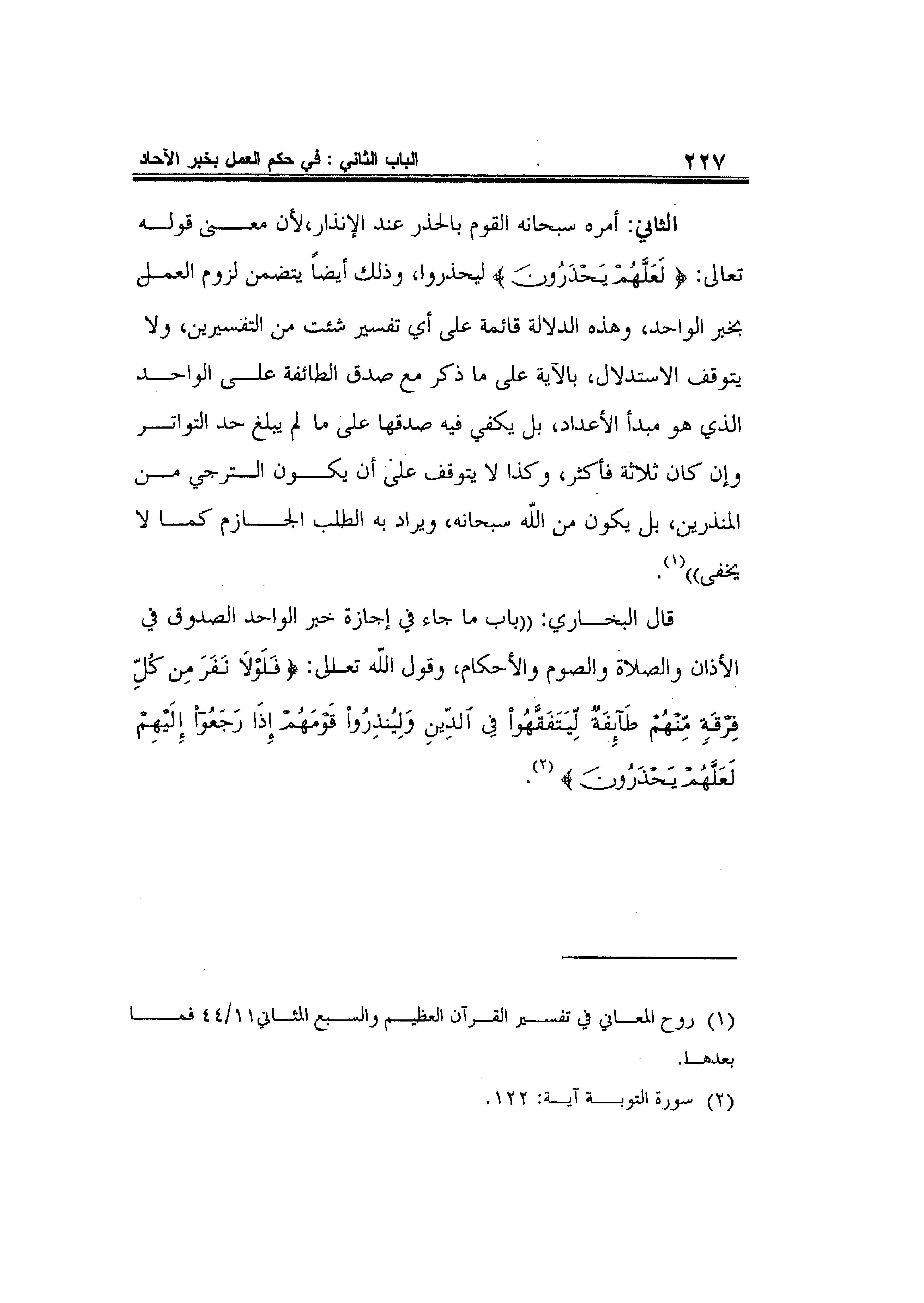 الثاني: أمره سبحانه القوم بالحذر عند الإنذار، لأن معنى قوله تعالى: {لَعَلَّهُمْ يَحْذَرُونَ} ليحذروا، وذلك أيضاً يتضمن لزوم العمل بخبر الواحد، وهذه الدلالة قائمة على أي تفسير شئت من التفسيرين، ولا يتوقف الاستدلال، بالآية على ما ذكر مع صدق الطائفة على الواحد الذي هو مبدأ الأعداد، بل يكفي فيه صدقها على ما لم يبلغ حد التواتر وإن كان ثلاثة فأكثر، وكذا لا يتوقف على أن يكون الترجي من المنذرين، بل يكون من الله سبحانه، ويراد به الطلب الجازم كما لا يخفى"1.