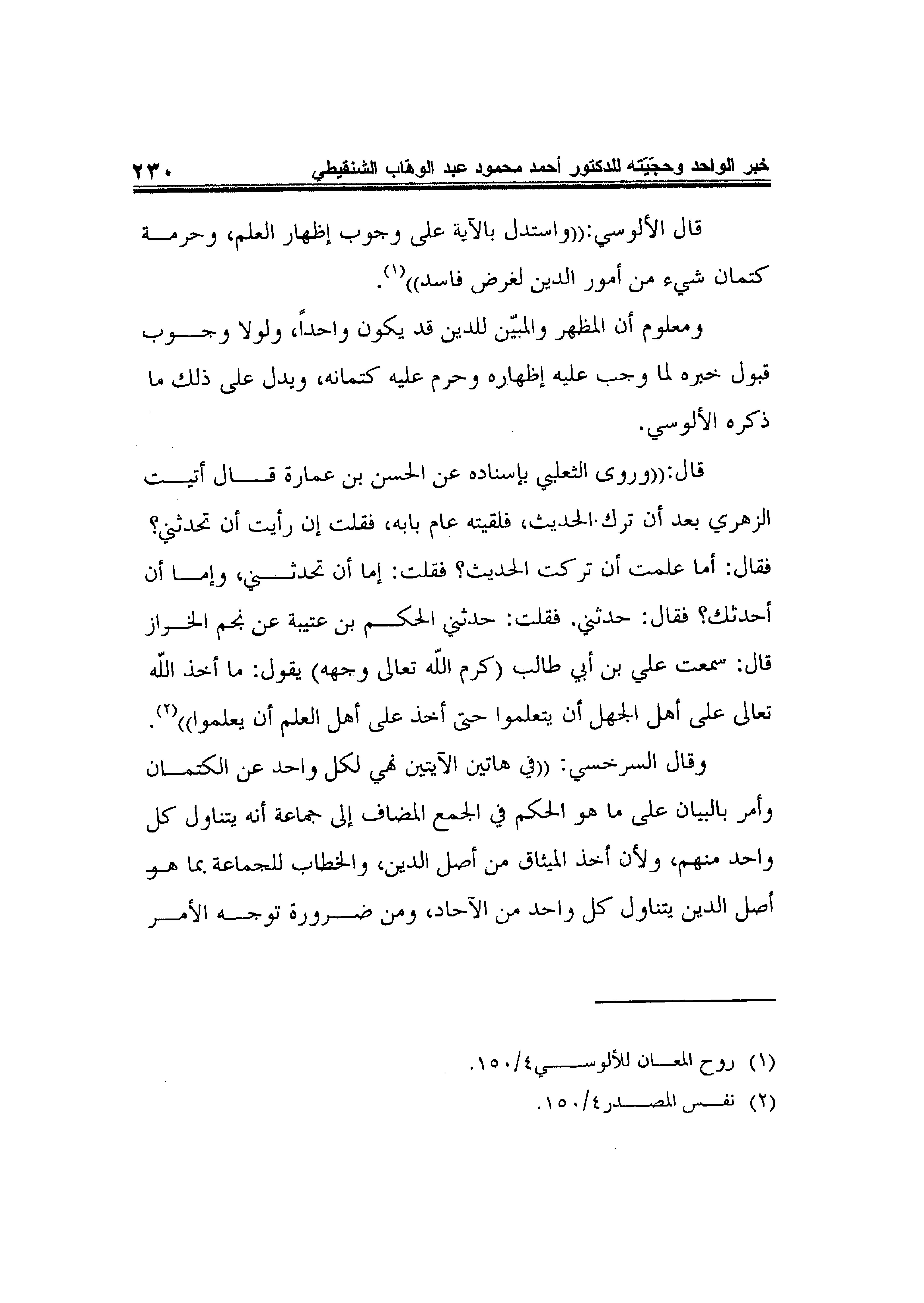قال الألوسي: "واستدل بالآية على وجوب إظهار العلم، وحرمة كتمان شيء من أمور الدين لغرض فاسد"1. ومعلوم أن المظهر والمبيّن للدين قد يكون واحداً، ولولا وجوب قبول خبره لما وجب عليه إظهاره وحرم عليه كتمانه، ويدل على ذلك ما ذكره الألوسي.