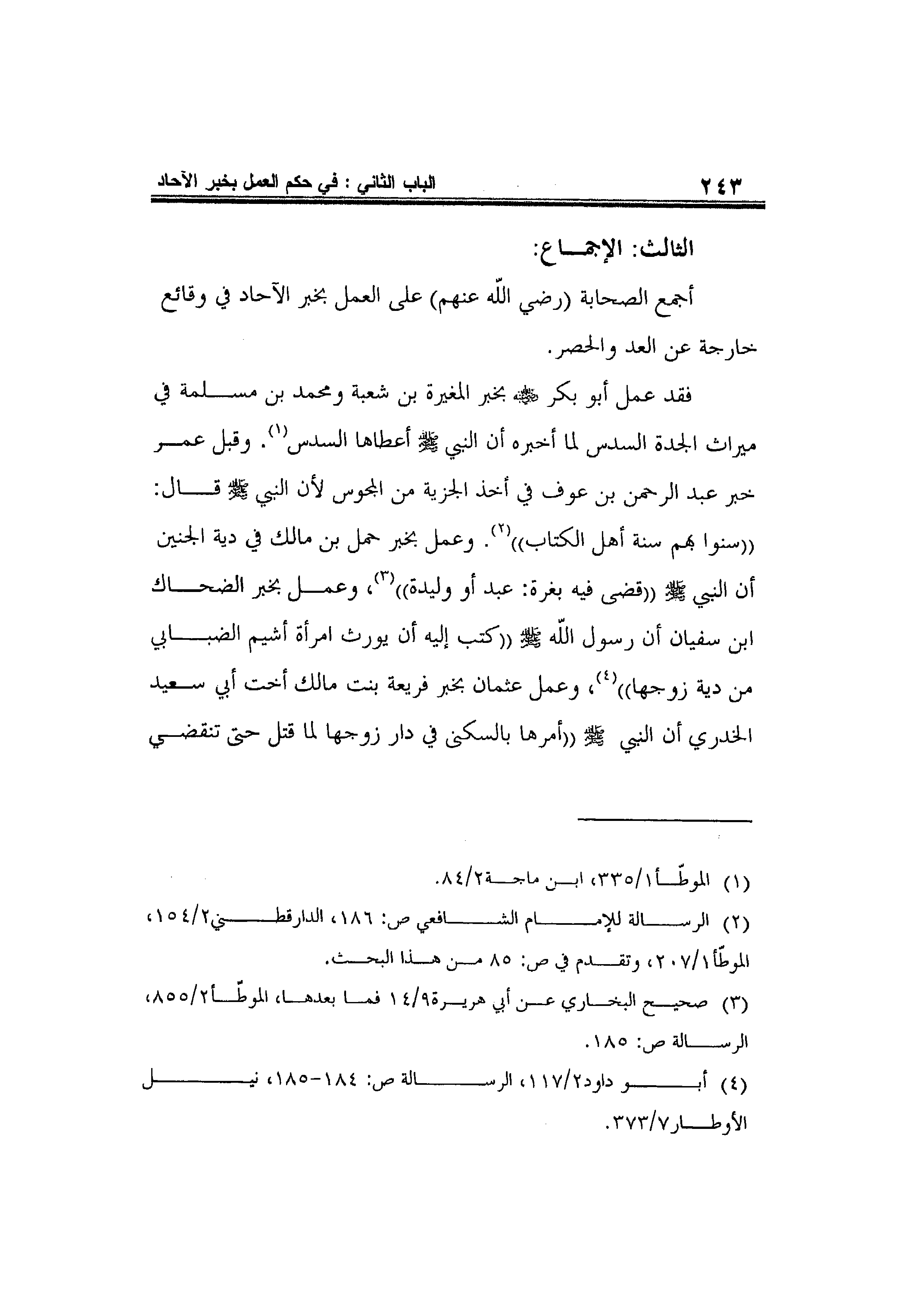 أجمع الصحابة -رضي الله عنهم- على العمل بخبر الآحاد في وقائع خارجة عن العد والحصر. فقد عمل أبو بكر رضي الله عنه بخبر المغيرة بن شعبة ومحمد بن مسلمة في ميراث الجدة السدس لما أخبره أن النبي صلى الله عليه وسلم أعطاها السدس1. وقبل عمر خبر عبد الرحمن بن عوف في أخذ الجزية من المجوس لأن النبي صلى الله عليه وسلم قال: "سنوا بهم سنة أهل الكتاب" 2. وعمل بخبر حمل ابن مالك في دية الجنين أن النبي صلى الله عليه وسلم " قضى فيه بغرة: عبد أو وليدة "3،وعمل بخبر الضحاك ابن سفيان أن رسول الله صلى الله عليه وسلم " كتب إليه أن يورث امرأة أشيم الضبابي من دية زوجها" 4،وعمل عثمان بخبر فريعة بنت مالك أخت أبي سعيد الخدري أن النبي صلى الله عليه وسلم "أمرها بالسكنى في دار زوجها لما قتل حتى تنقضي