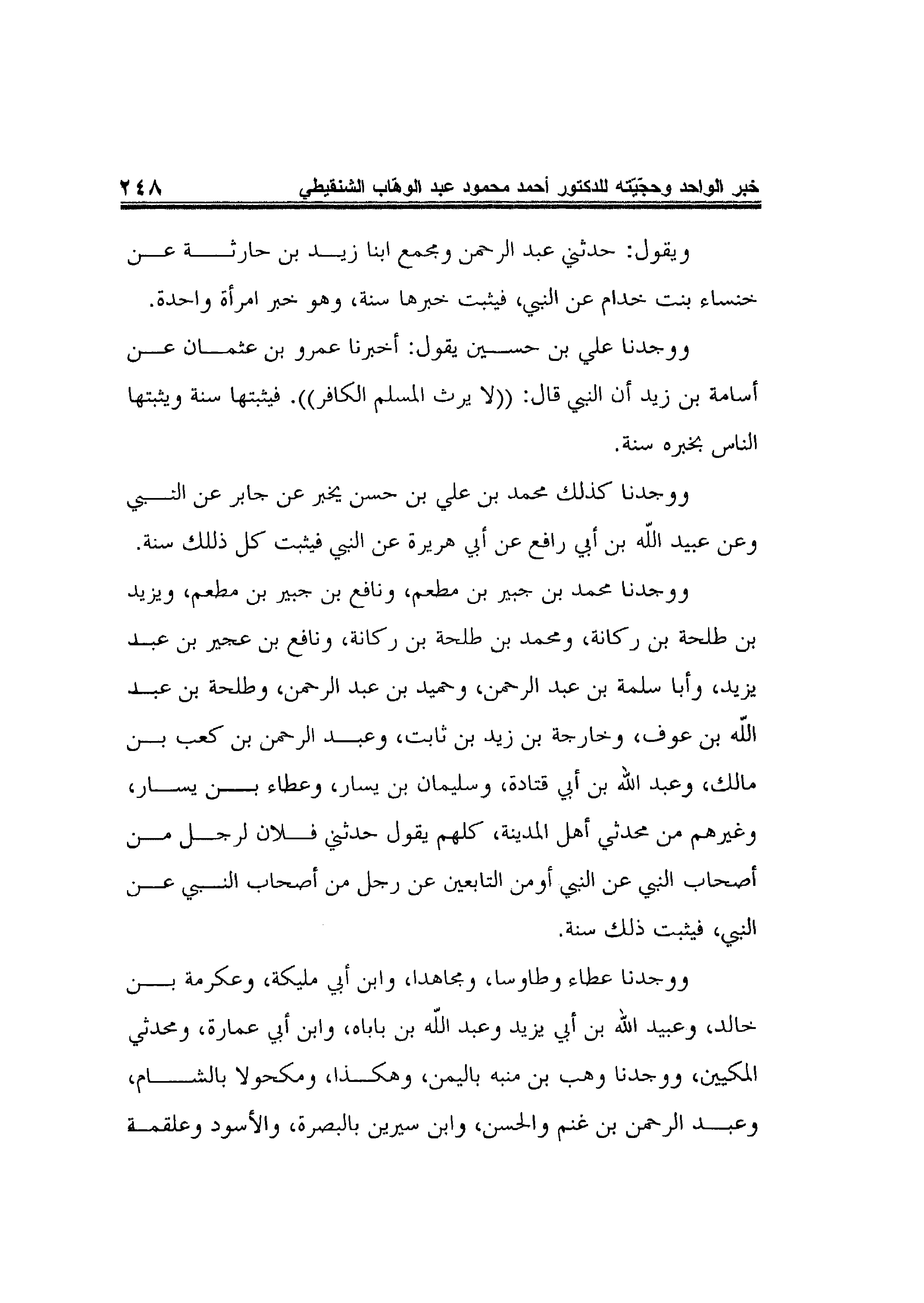 ووجدنا علي بن حسين يقول: أخبرنا عمرو بن عثمان عن أسامة بن زيد أن النبي قال: "لا يرث المسلم الكافر". فيثبتها سنة ويثبتها الناس بخبره سنة.