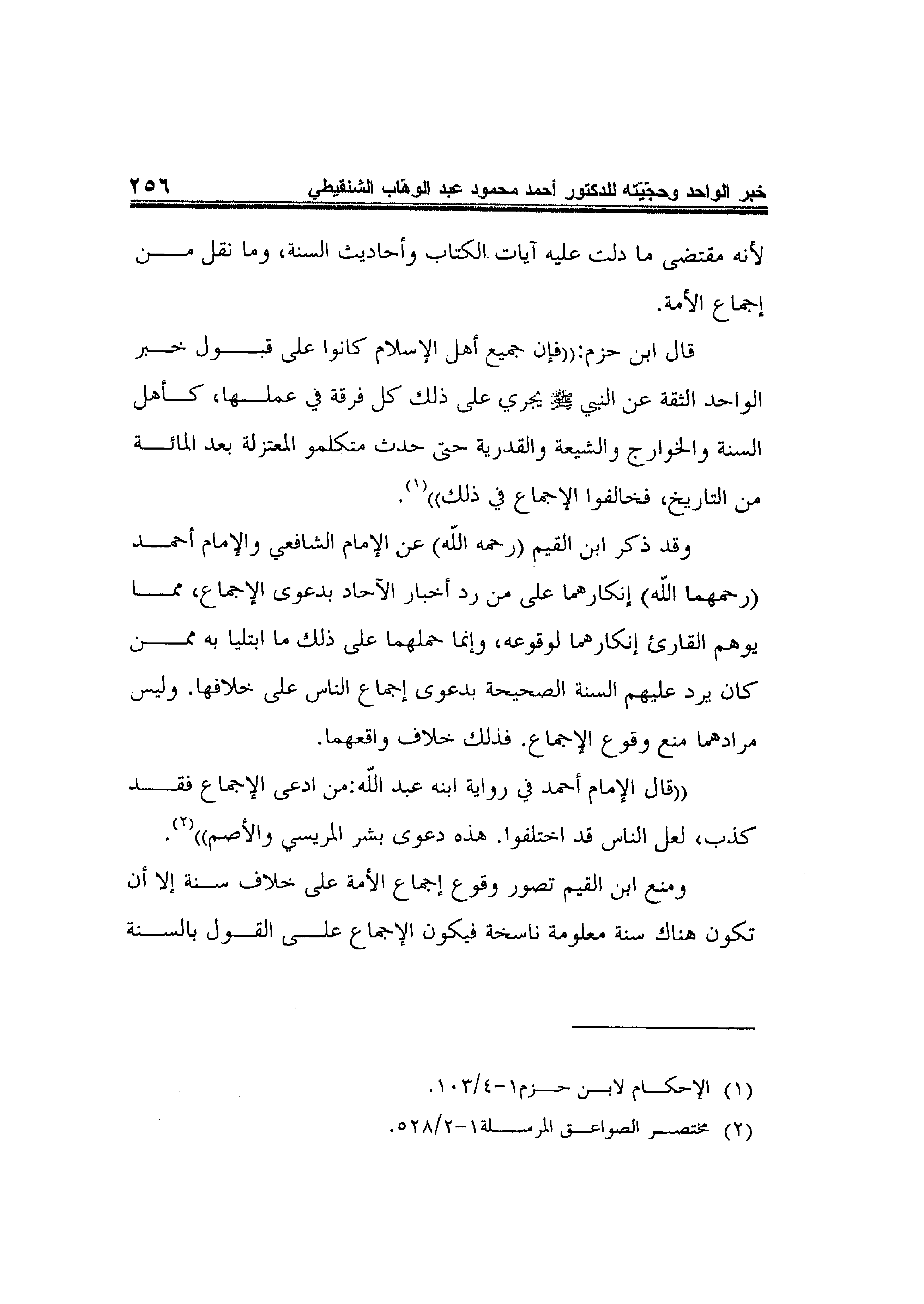 وقد ذكر ابن القيم -رحمه الله- عن الإمام الشافعي والإمام أحمد -رحمهما الله- إنكارهما على من رد أخبار الآحاد بدعوى الإجماع، مما يوهم القارئ إنكارهما لوقوعه، وإنما حملهما على ذلك ما ابتليا به ممن كان يرد عليهم السنة الصحيحة بدعوى إجماع الناس على خلافها. وليس مرادهما منع وقوع الإجماع. فذلك خلاف واقعهما. "قال الإمام أحمد في رواية ابنه عبد الله: من ادعى الإجماع فقد كذب، لعل الناس قد اختلفوا. هذه دعوى بشر المريسي والأصم"2.