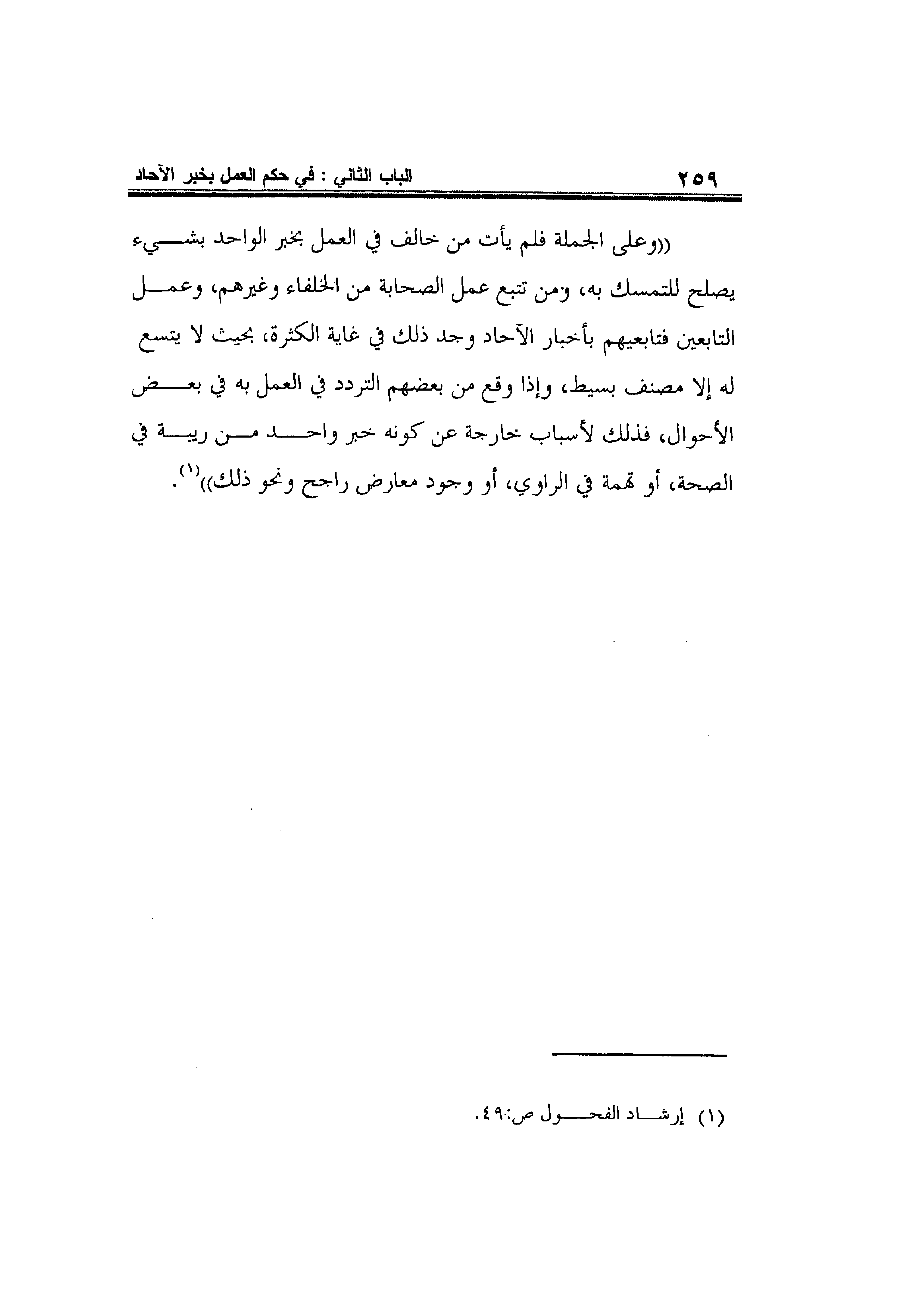 "وعلى الجملة فلم يأت من خالف في العمل بخبر الواحد بشيء يصلح للتمسك به، ومن تتبع عمل الصحابة من الخلفاء وغيرهم، وعمل التابعين فتابعيهم بأخبار الآحاد وجد ذلك في غاية الكثرة، بحيث لا يتسع له إلا مصنف بسيط، وإذا وقع من بعضهم التردد في العمل به في بعض الأحوال، فذلك لأسباب خارجة عن كونه خبر واحد من ريبة في الصحة، أو تهمة في الراوي، أو وجود معارض راجح ونحو ذلك"1.