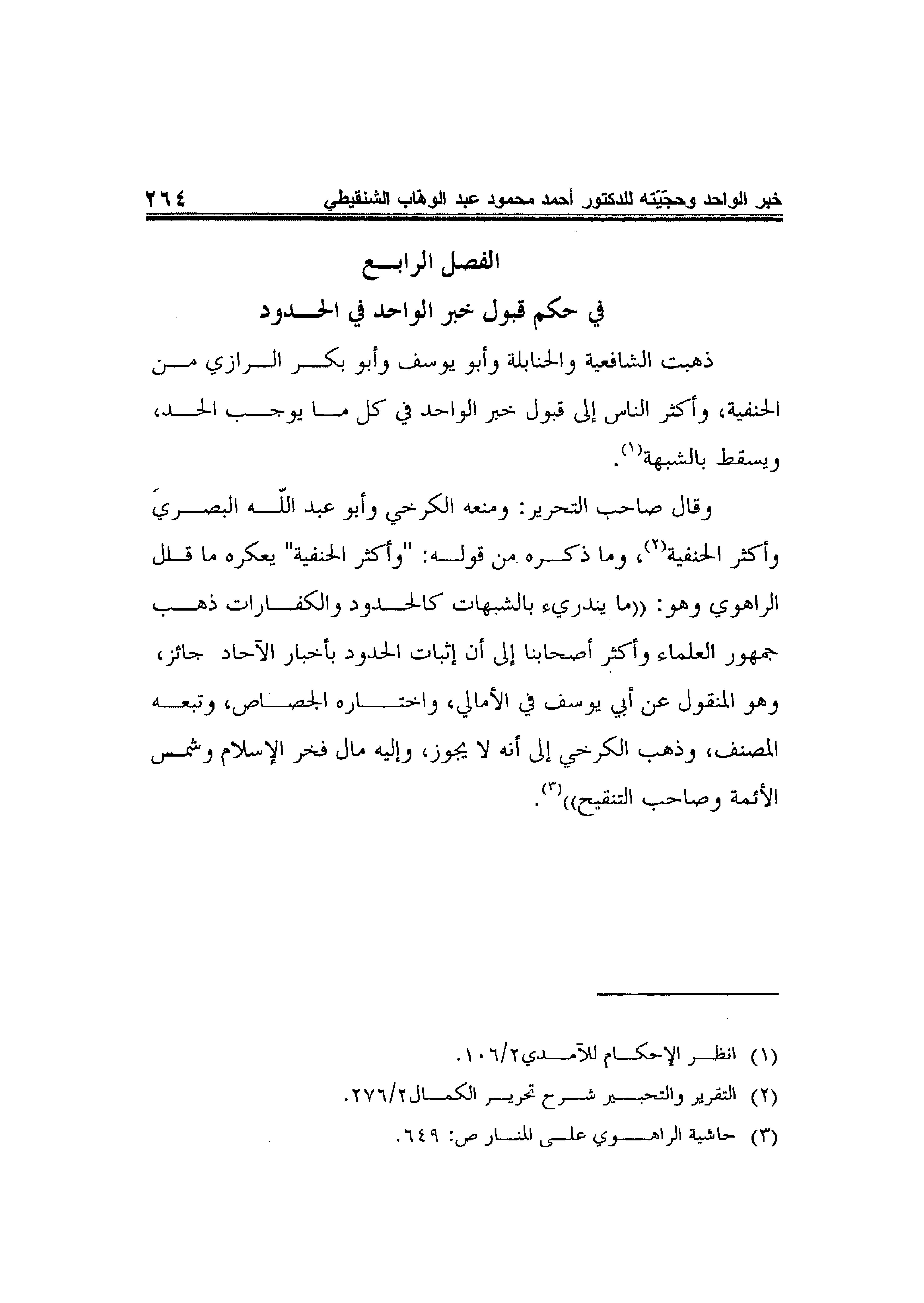 وقال صاحب التحرير: "ومنعه الكرخي وأبو عبد الله البصريَ وأكثر الحنفية2،وما ذكره من قوله: "وأكثر الحنفية" يعكره ما قال الراهوي وهو: "ما يندريء بالشبهات كالحدود والكفارات ذهب جمهور العلماء وأكثر أصحابنا إلى أن إثبات الحدود بأخبار الآحاد جائز، وهو المنقول عن أبي يوسف في الأمالي، واختاره الجصاص، وتبعه المصنف، وذهب الكرخي إلى أنه لا يجوز، وإليه مال فخر الإسلام وشمس الأئمة وصاحب التنقيح"3.