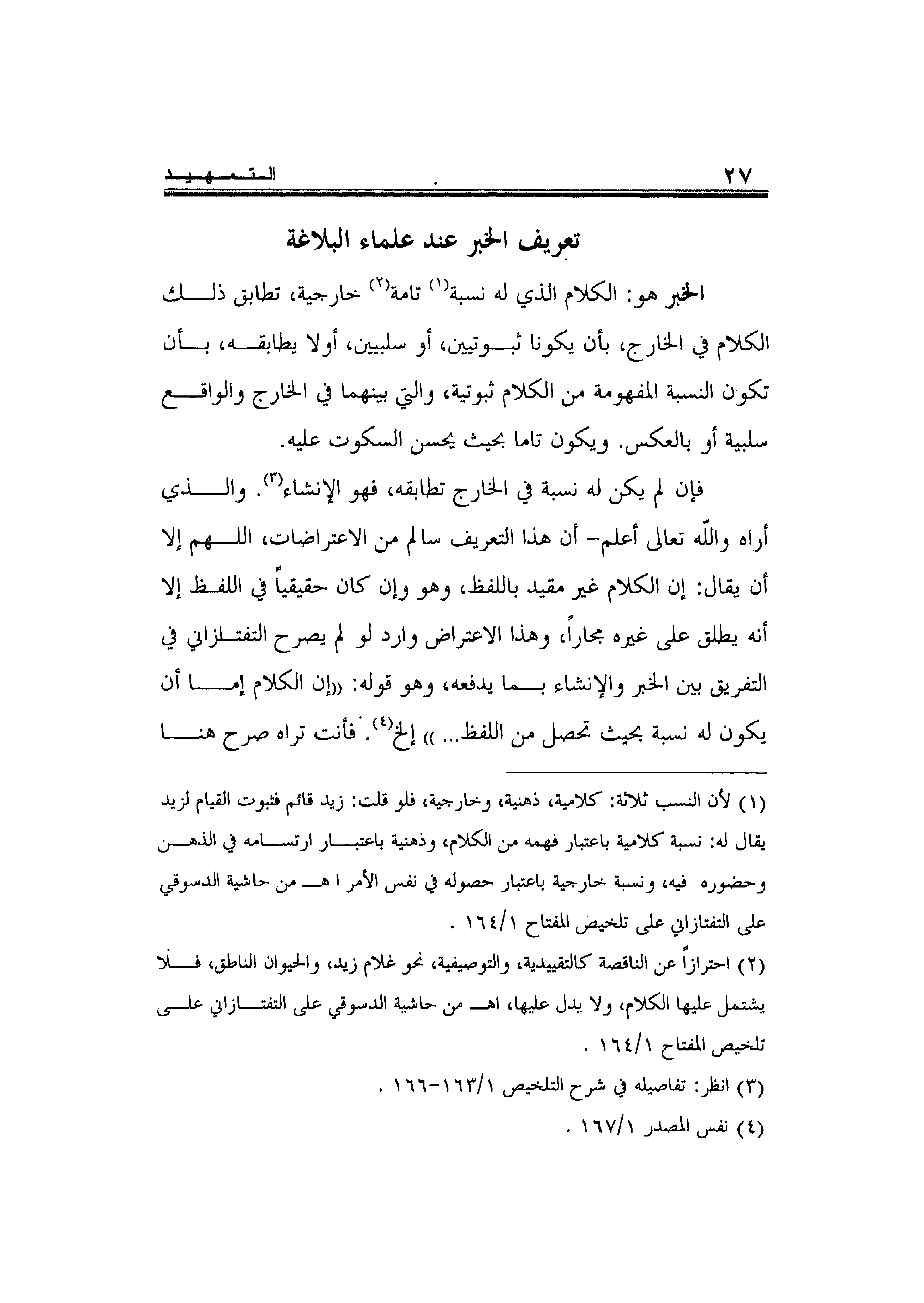 فإن لم يكن له نسبة في الخارج تطابقه، فهو الإنشاء3. والذي أراه والله تعالى أعلم- أن هذا التعريف سالم من الاعتراضات، اللهم إلا أن يقال: إن الكلام غير مقيد باللفظ، وهو وإن كان حقيقياً في اللفظ إلا أنه يطلق على غيره مجاراً، وهذا الاعتراض وارد لو لم يصرح التفتازاني في التفريق بين الخبر والإنشاء بما يدفعه، وهو قوله: "إن الكلام إما أن يكون له نسبة بحيث تحصل من اللفظ… " إلخ4. فأنت تراه صرح هنا