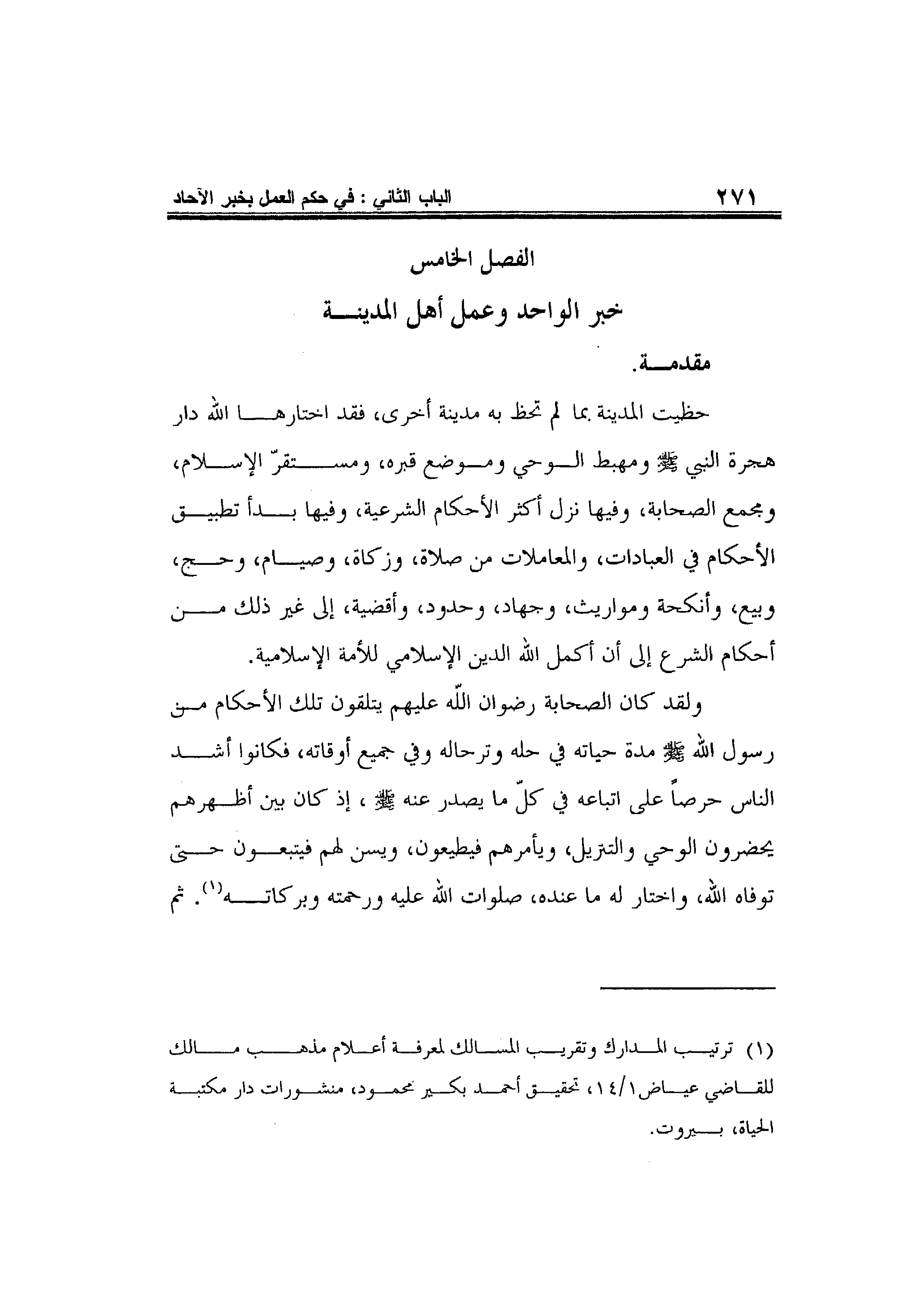 الفصل الخامس: خبر الواحد وعمل أهل المدينة