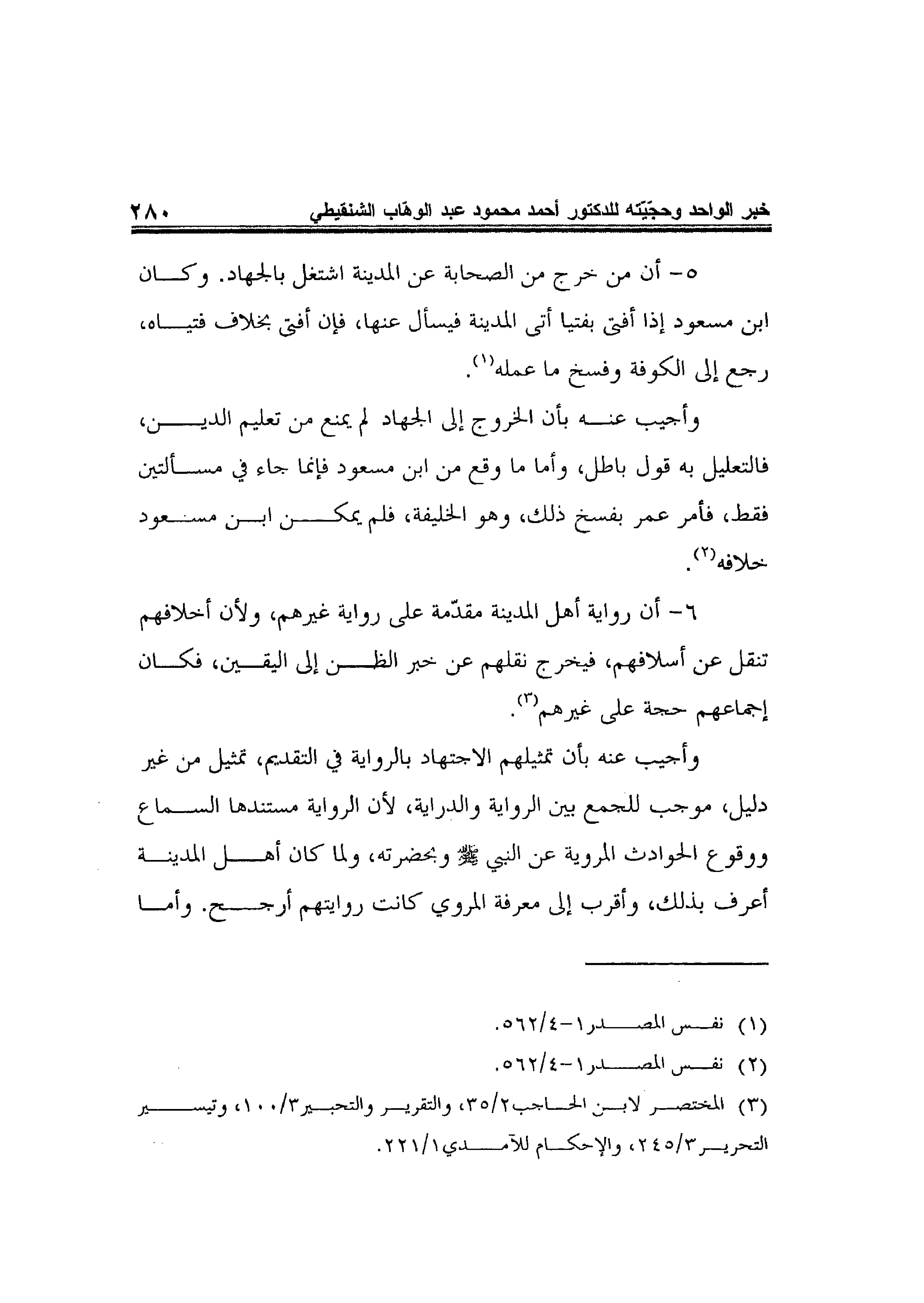 5- أن من خرج من الصحابة عن المدينة اشتغل بالجهاد. وكان ابن مسعود إذا أفتى بفتيا أتى المدينة فيسأل عنها، فإن أفتى بخلاف فتياه، رجع إلى الكوفة وفسخ ما عمله1.