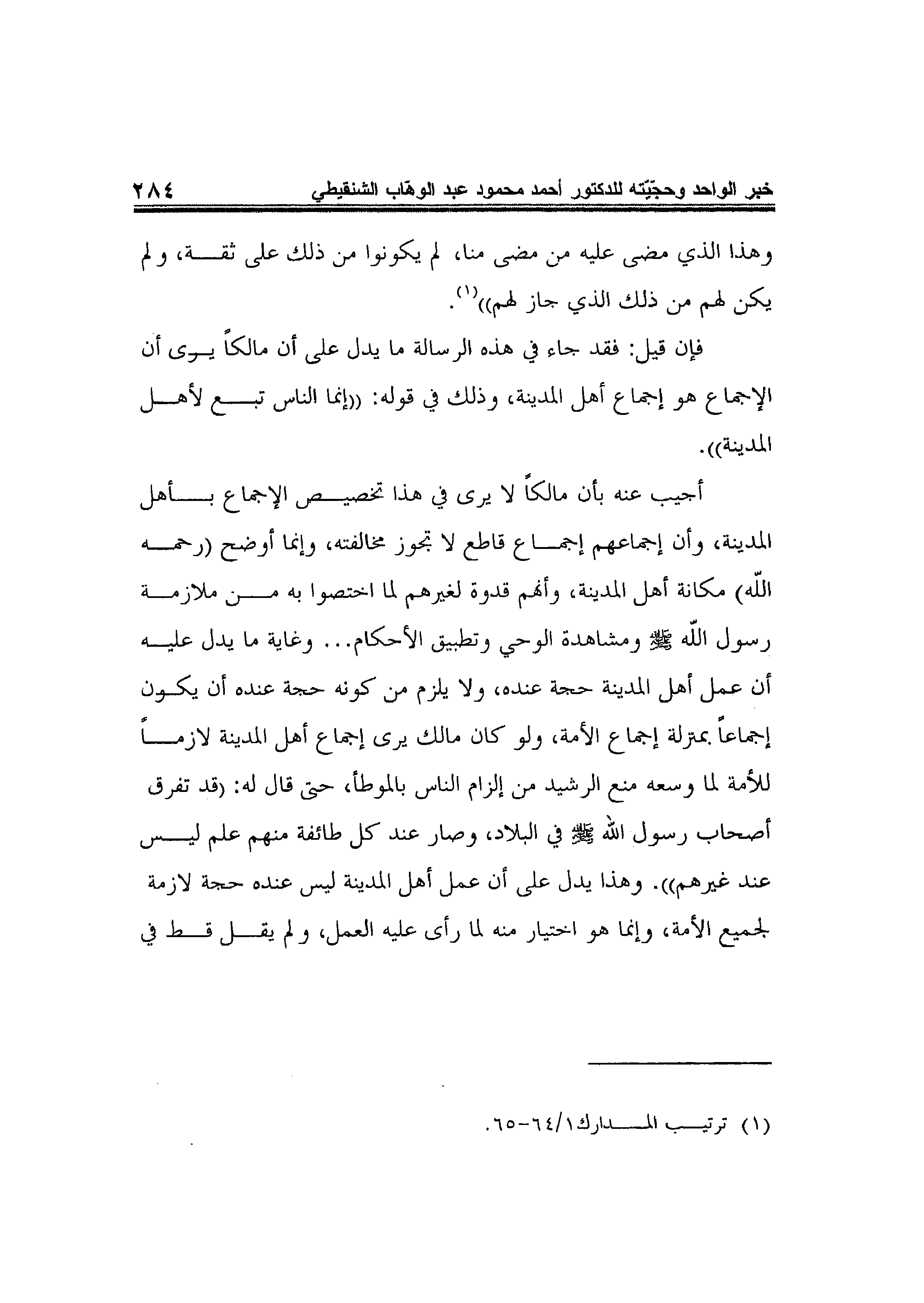 أجيب عنه بأن مالكاً لا يرى في هذا تخصيص الإجماع بأهل المدينة، وأن إجماعهم إجماع قاطع لا تجوز مخالفته، وإنما أوضح -رحمه الله- مكانة أهل المدينة، وأنهم قدوة لغيرهم لما اختصوا به من ملازمة رسول الله صلى الله عليه وسلم ومشاهدة الوحي وتطبيق الأحكام… وغاية ما يدل عليه أن عمل أهل المدينة حجة عنده، ولا يلزم من كونه حجة عنده أن يكون إجماعاً بمنزلة إجماع الأمة، ولو كان مالك يرى إجماع أهل المدينة لازماً للأمة لما وسعه منع الرشيد من إلزام الناس بالموطأ، حتى قال له: "قد تفرق أصحاب رسول الله صلى الله عليه وسلم في البلاد، وصار عند كل طائفة منهم علم ليس عند غيرهم". وهذا يدل على أن عمل أهل المدينة ليس عنده حجة لازمة لجميع الأمة، وإنما هو اختيار منه لما رأى عليه العمل، ولم يقل قط في