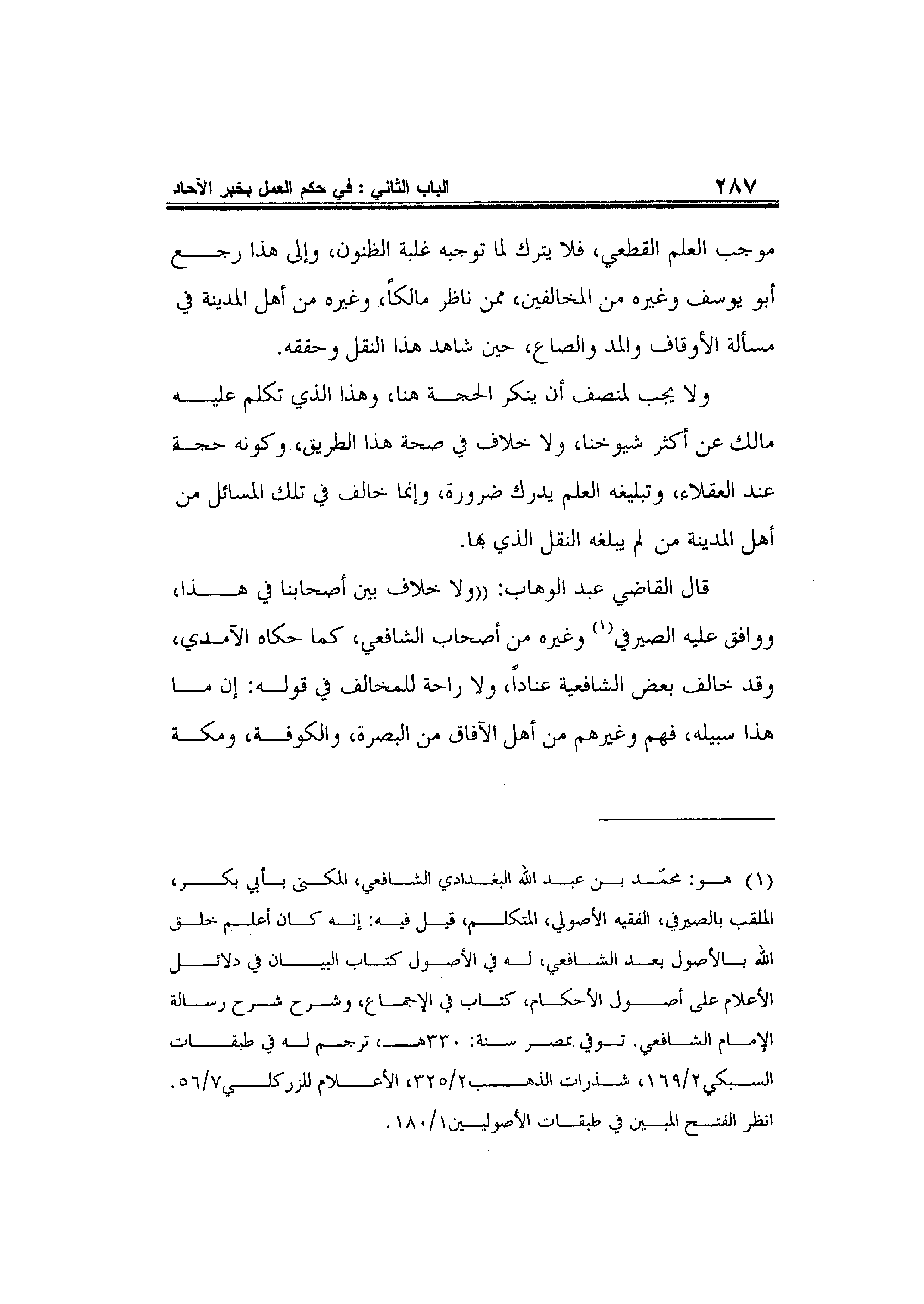 1 هو: محمّد بن عبد الله البغدادي الشافعي، المكنى بأبي بكر، الملقب بالصيرفي، الفقيه الأصولي، المتكلم، قيل فيه: إنه كان أعلم خلق الله بالأصول بعد الشافعي، له في الأصول كتاب البيان في دلائل الأعلام على أصول الأحكام، كتاب في الإجماع، وشرح شرح رسالة الإمام الشافعي. توفي بمصر سنة: 330هـ، ترجم له في طبقات السبكي2/169، شذرات الذهب2/325، الأعلام للزركلي7/56. انظر الفتح المبين في طبقات الأصوليين1/180.