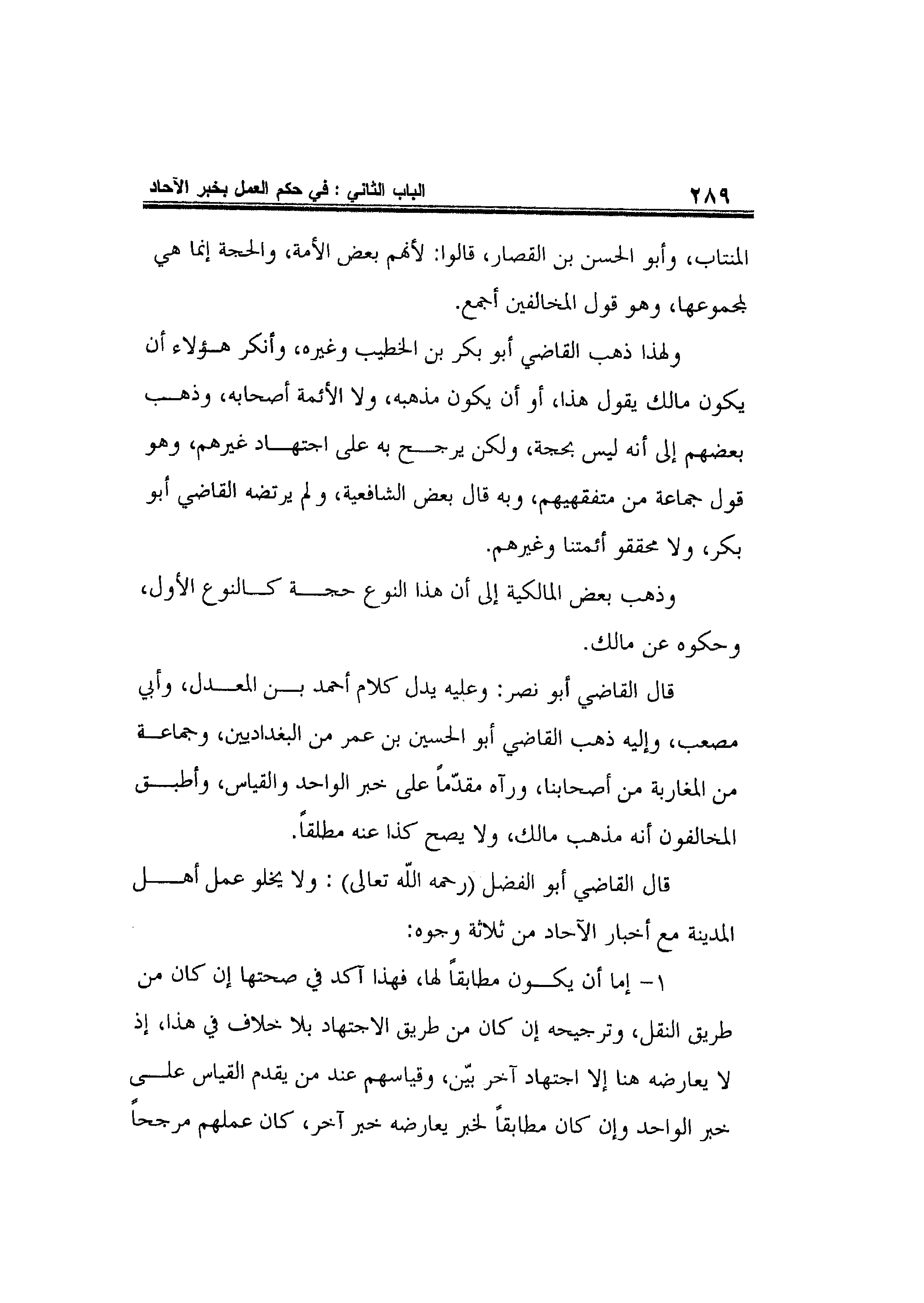 ولهذا ذهب القاضي أبو بكر بن الخطيب وغيره، وأنكر هؤلاء أن يكون مالك يقول هذا، أو أن يكون مذهبه، ولا الأئمة أصحابه، وذهب بعضهم إلى أنه ليس بحجة، ولكن يرجح به على اجتهاد غيرهم، وهو قول جماعة من متفقهيهم، وبه قال بعض الشافعية، ولم يرتضه القاضي أبو بكر، ولا محققو أئمتنا وغيرهم.