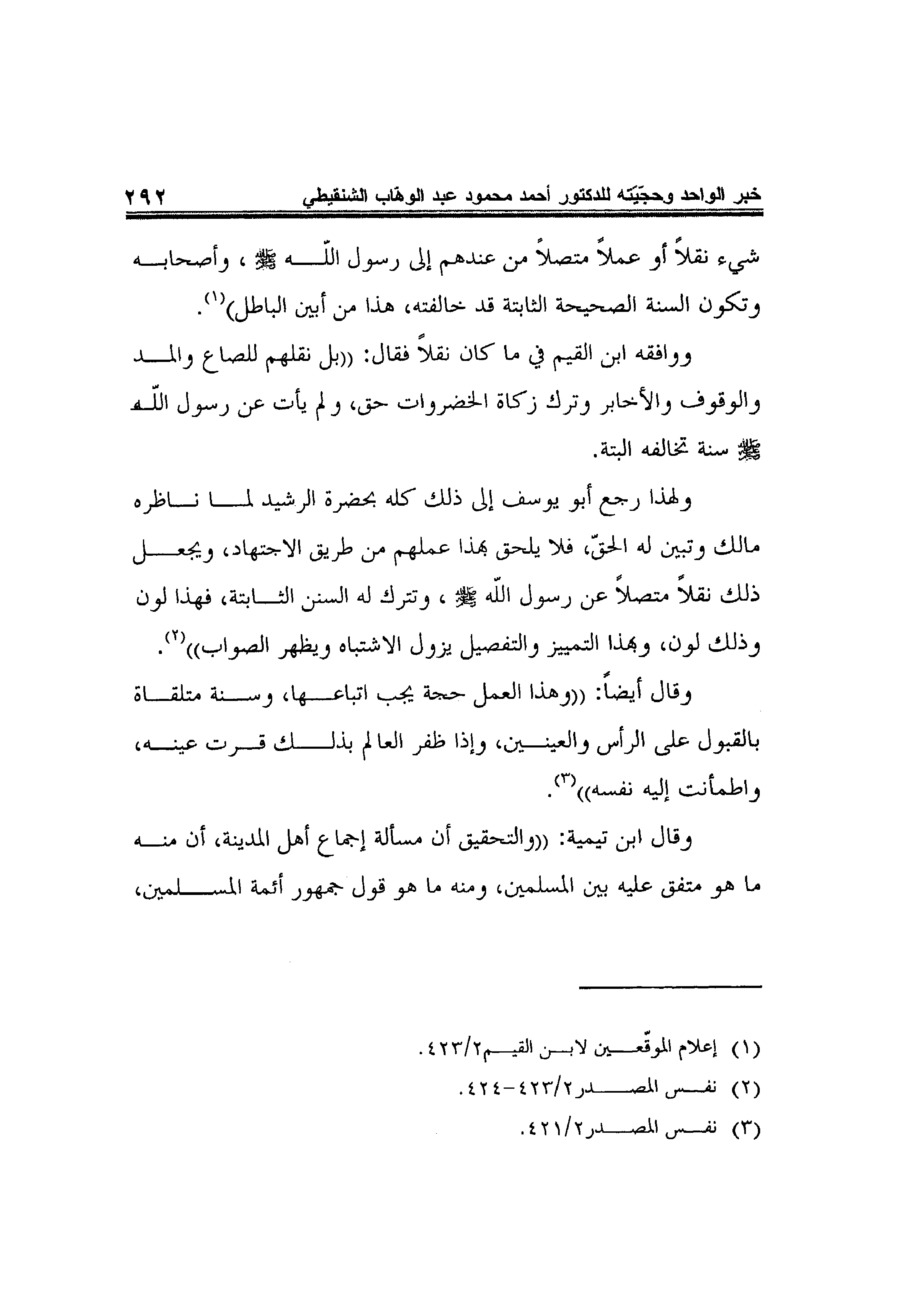 ووافقه ابن القيم في ما كان نقلاً فقال: "بل نقلهم للصاع والمد والوقوف والأخابر وترك زكاة الخضروات حق، ولم يأت عن رسول الله صلى الله عليه وسلم سنة تخالفه البتة. ولهذا رجع أبو يوسف إلى ذلك كله بحضرة الرشيد لما ناظره مالك وتبين له الحقّ، فلا يلحق بهذا عملهم من طريق الاجتهاد، ويجعل ذلك نقلاً متصلاً عن رسول الله صلى الله عليه وسلم،وتترك له السنن الثابتة، فهذا لون وذلك لون، وبهذا التمييز والتفصيل يزول الاشتباه ويظهر الصواب"2.