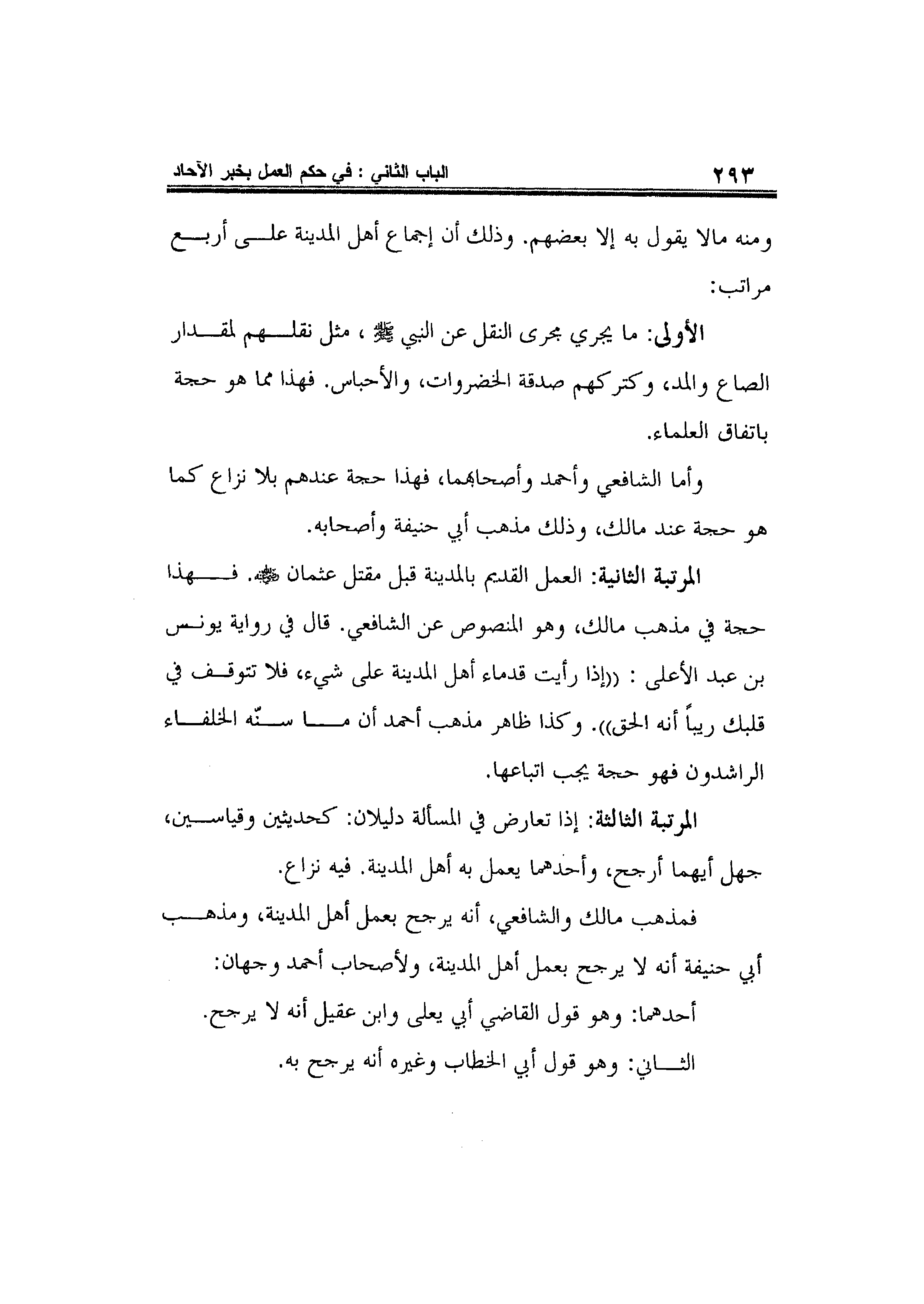 المرتبة الثانية: العمل القديم بالمدينة قبل مقتل عثمان رضي الله عنه. فهذا حجة في مذهب مالك، وهو المنصوص عن الشافعي. قال في رواية يونس بن عبد الأعلى: "إذا رأيت قدماء أهل المدينة على شيء، فلا تتوقف في قلبك ريباً أنه الحق". وكذا ظاهر مذهب أحمد أن ما سنّه الخلفاء الراشدون فهو حجة يجب اتباعها.