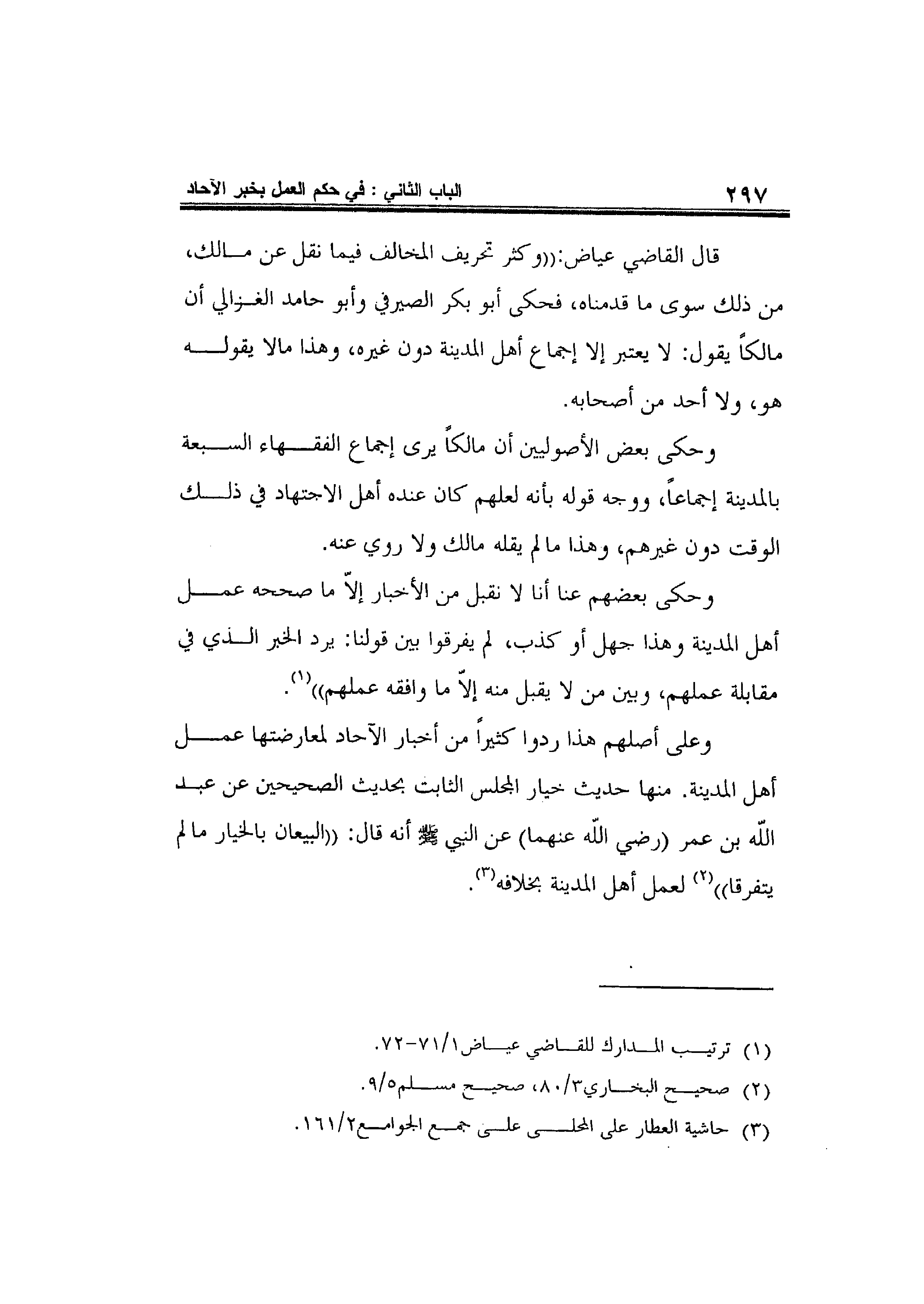وعلى أصلهم هذا ردوا كثيراً من أخبار الآحاد لمعارضتها عمل أهل المدينة. منها حديث خيار المجلس الثابت بحديث الصحيحين عن عبد الله بن عمر -رضي الله عنهما- عن النبي صلى الله عليه وسلم أنه قال: "البيعان بالخيار مالم يتفرقا" 2 لعمل أهل المدينة بخلافه3.