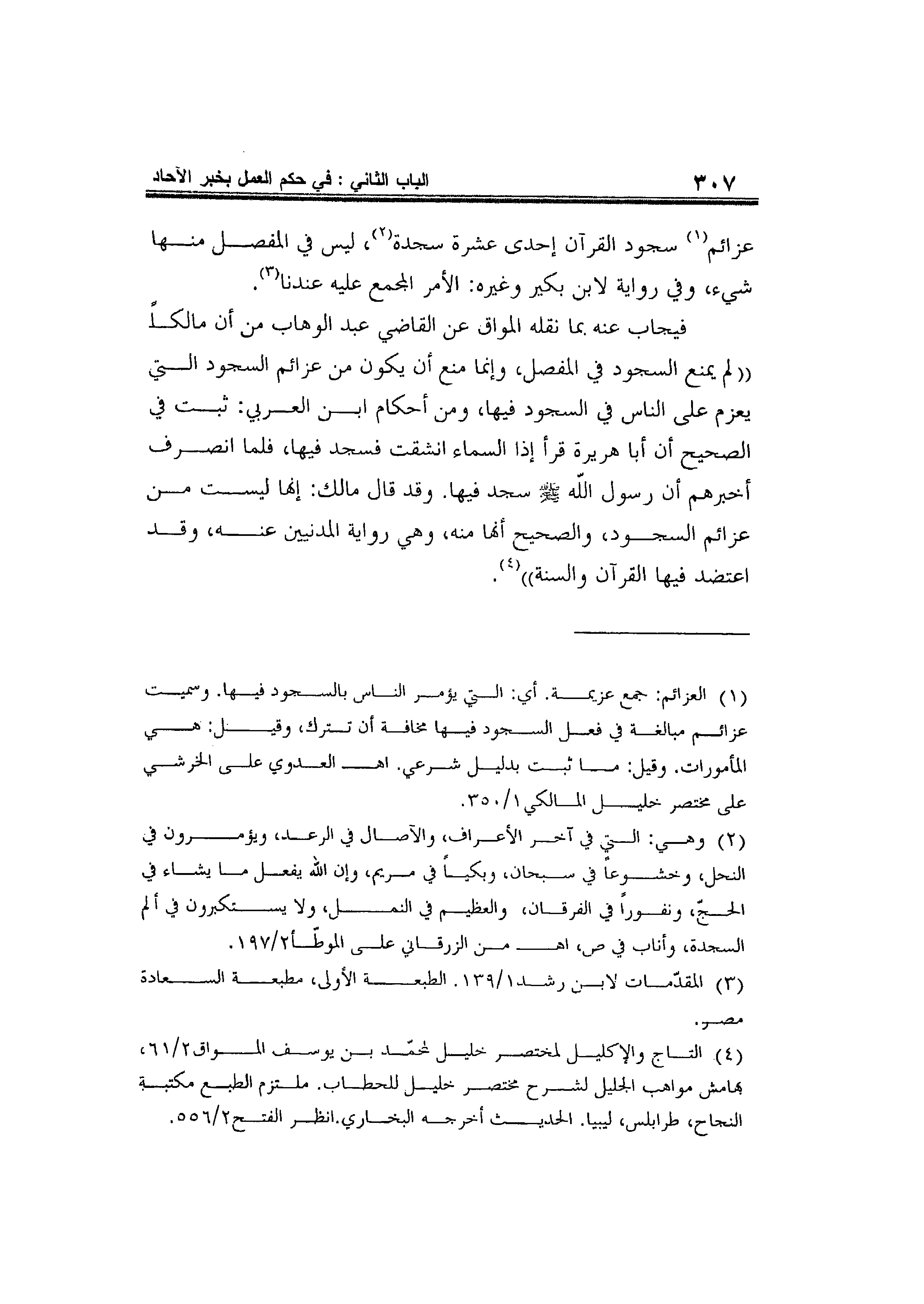 عزائم1 سجود القرآن إحدى عشرة سجدة2، ليس في المفصل منها شيء، وفي رواية لابن بكير وغيره: الأمر المجمع عليه عندنا3.