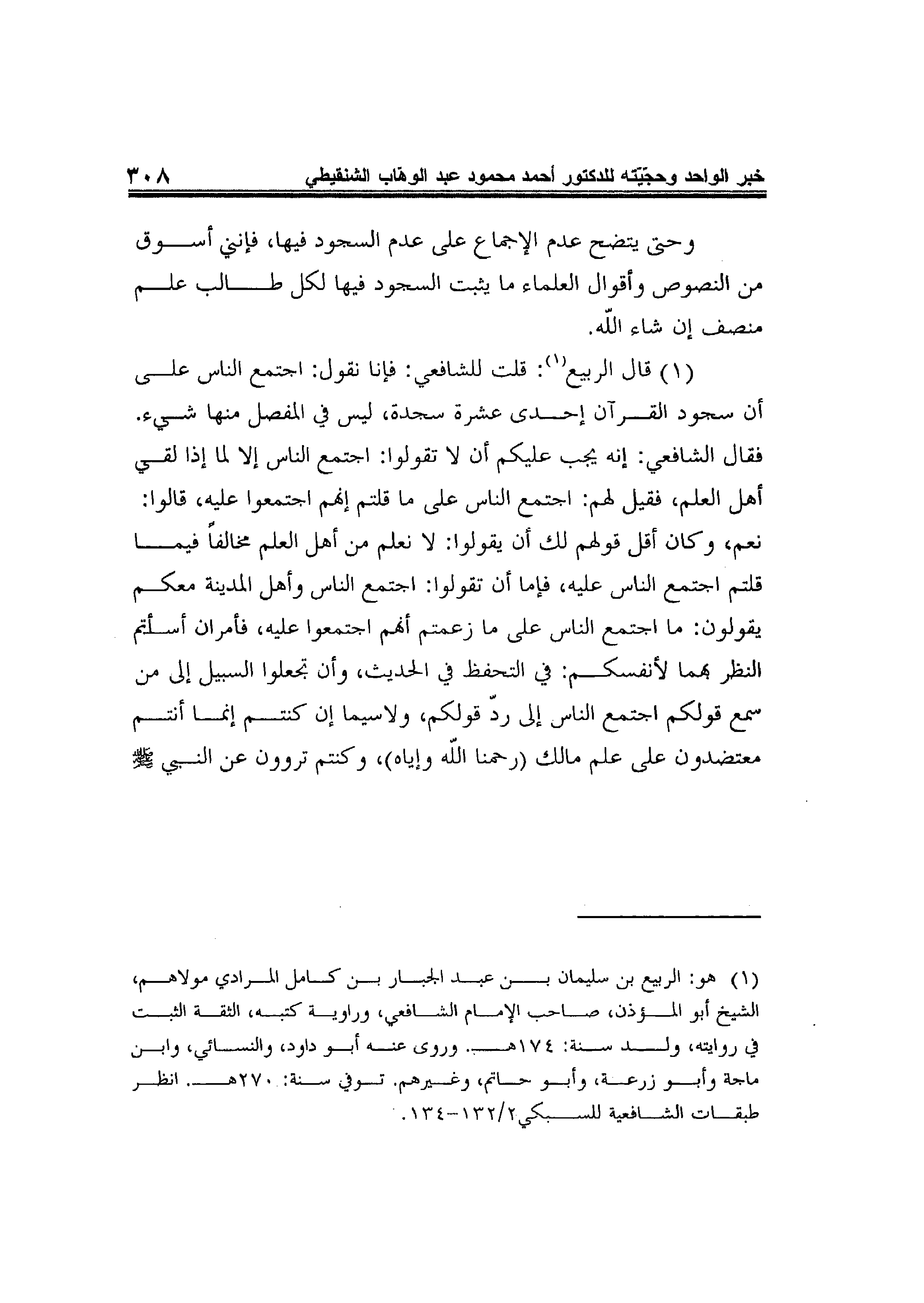 1 قال الربيع1: "قلت للشافعي: فإنا نقول: اجتمع الناس على أن سجود القرآن إحدى عشرة سجدة، ليس في المفصل منها شيء". فقال الشافعي: "إنه يجب عليكم أن لا تقولوا: اجتمع الناس إلا لما إذا لقي أهل العلم، فقيل لهم: اجتمع الناس على ما قلتم إنهم اجتمعوا عليه، قالوا: نعم، وكان أقل قولهم لك أن يقولوا: لا نعلم من أهل العلم مخالفاً فيما قلتم اجتمع الناس عليه، فإما أن تقولوا: اجتمع الناس وأهل المدينة معكم يقولون: ما اجتمع الناس على ما زعمتم أنهم اجتمعوا عليه، فأمران أسأتم النظر بهما لأنفسكم: في التحفظ في الحديث، وأن تجعلوا السبيل إلى من سمع قولكم اجتمع الناس إلى ردّ قولكم، ولاسيما إن كنتم إنما أنتم معتضدون على علم مالك -رحمنا الله وإياه-، وكنتم تروون عن النبي صلى الله عليه وسلم