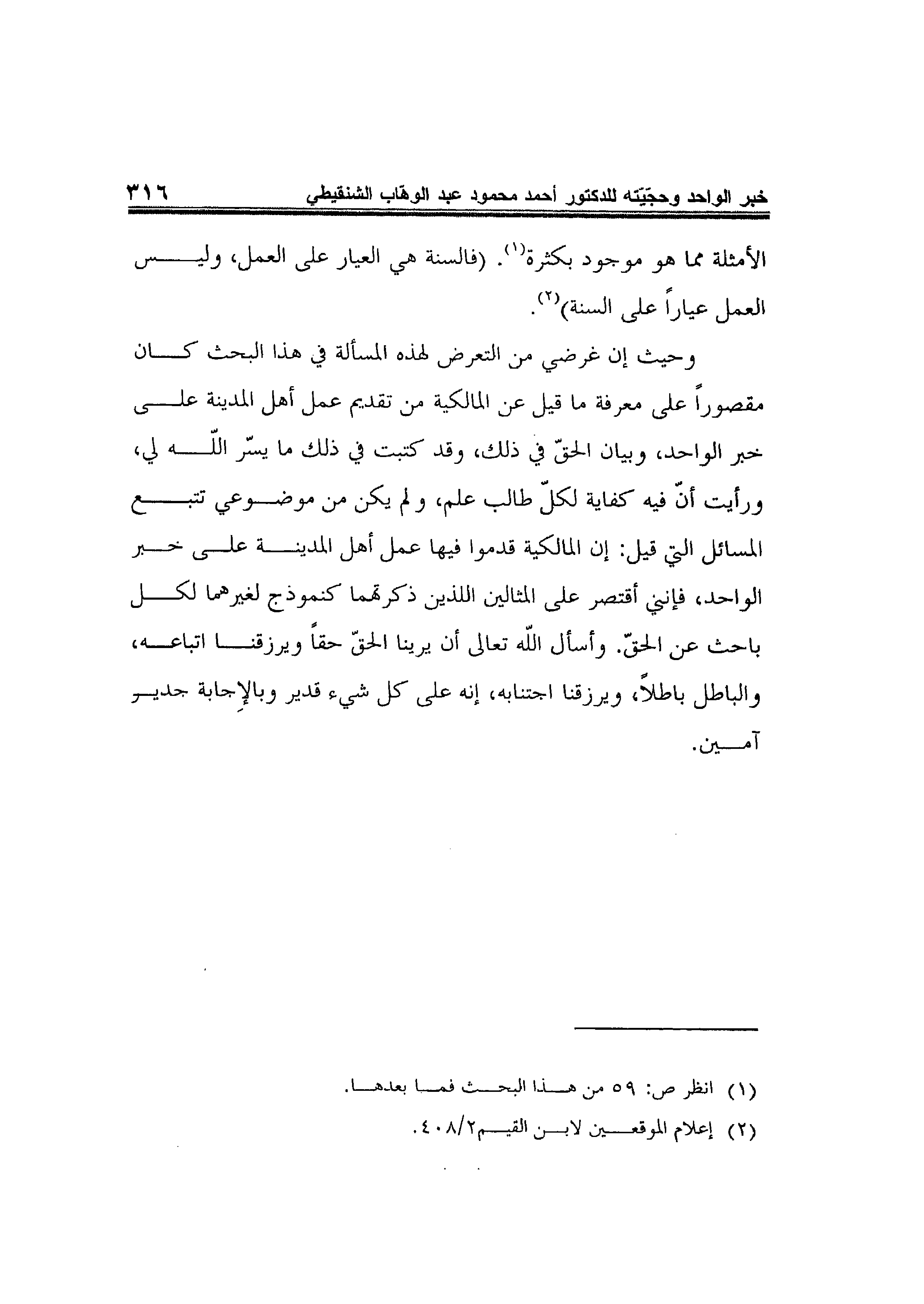 وحيث إن غرضي من التعرض لهذه المسألة في هذا البحث كان مقصوراً على معرفة ما قيل عن المالكية من تقديم عمل أهل المدينة على خبر الواحد، وبيان الحقّ في ذلك، وقد كتبت في ذلك ما يسّر الله لي، ورأيت أنّ فيه كفاية لكلّ طالب علم، ولم يكن من موضوعي تتبع المسائل التي قيل: إن المالكية قدموا فيها عمل أهل المدينة على خبر الواحد، فإنني أقتصر على المثالين اللذين ذكرتهما كنموذج لغيرهما لكل باحث عن الحقّ. وأسأل الله تعالى أن يرينا الحقّ حقاً ويرزقنا اتباعه، والباطل باطلاً، ويرزقنا اجتنابه، إنه على كل شيء قدير وبالإِجابة جدير آمين.