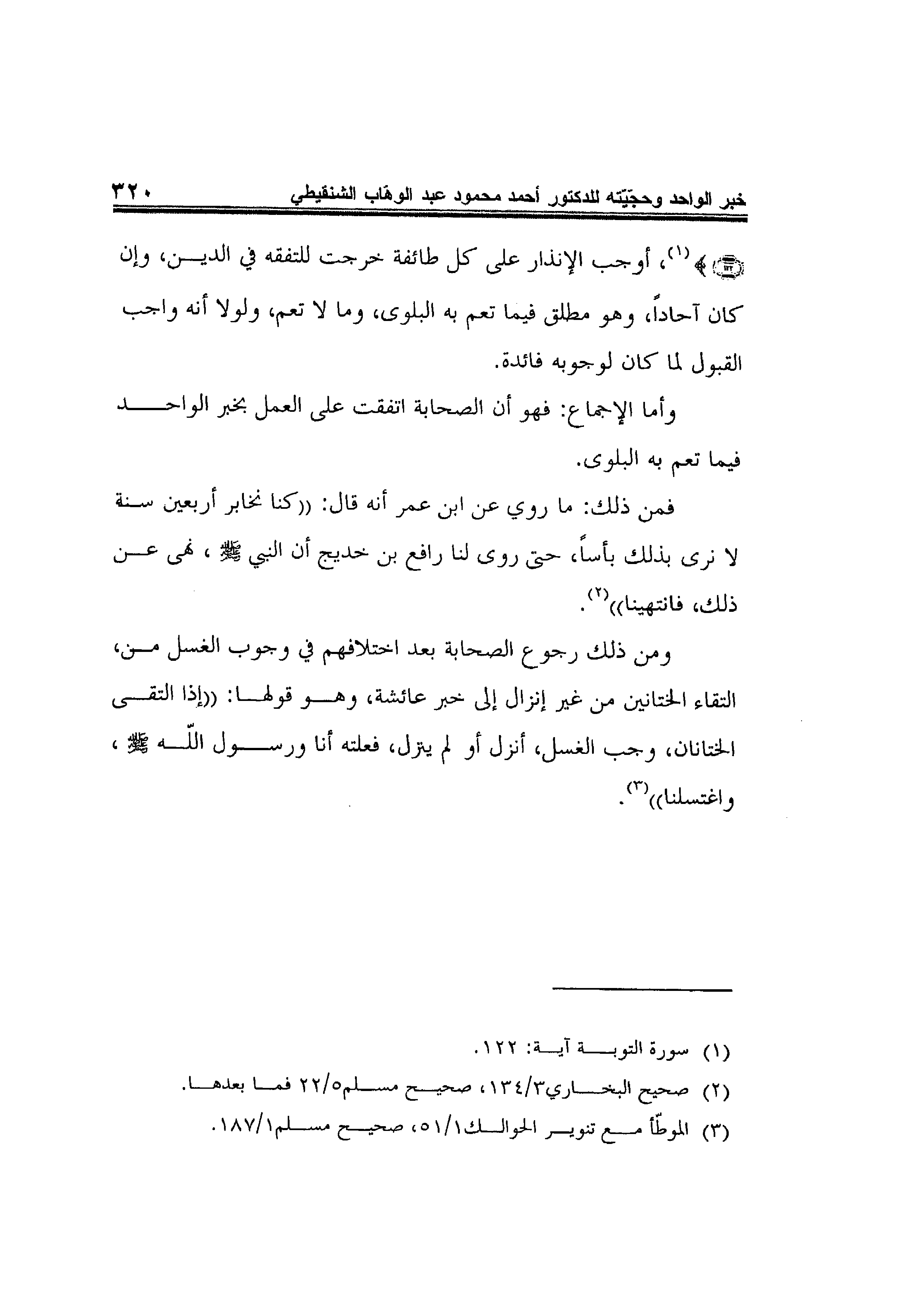 ومن ذلك رجوع الصحابة بعد اختلافهم في وجوب الغسل من، التقاء الختانين من غير إنزال إلى خبر عائشة، وهو قولها: "إذا التقى الختانان، وجب الغسل، أنزل أو لم ينزل، فعلته أنا ورسول الله صلى الله عليه وسلم،واغتسلنا" 2.