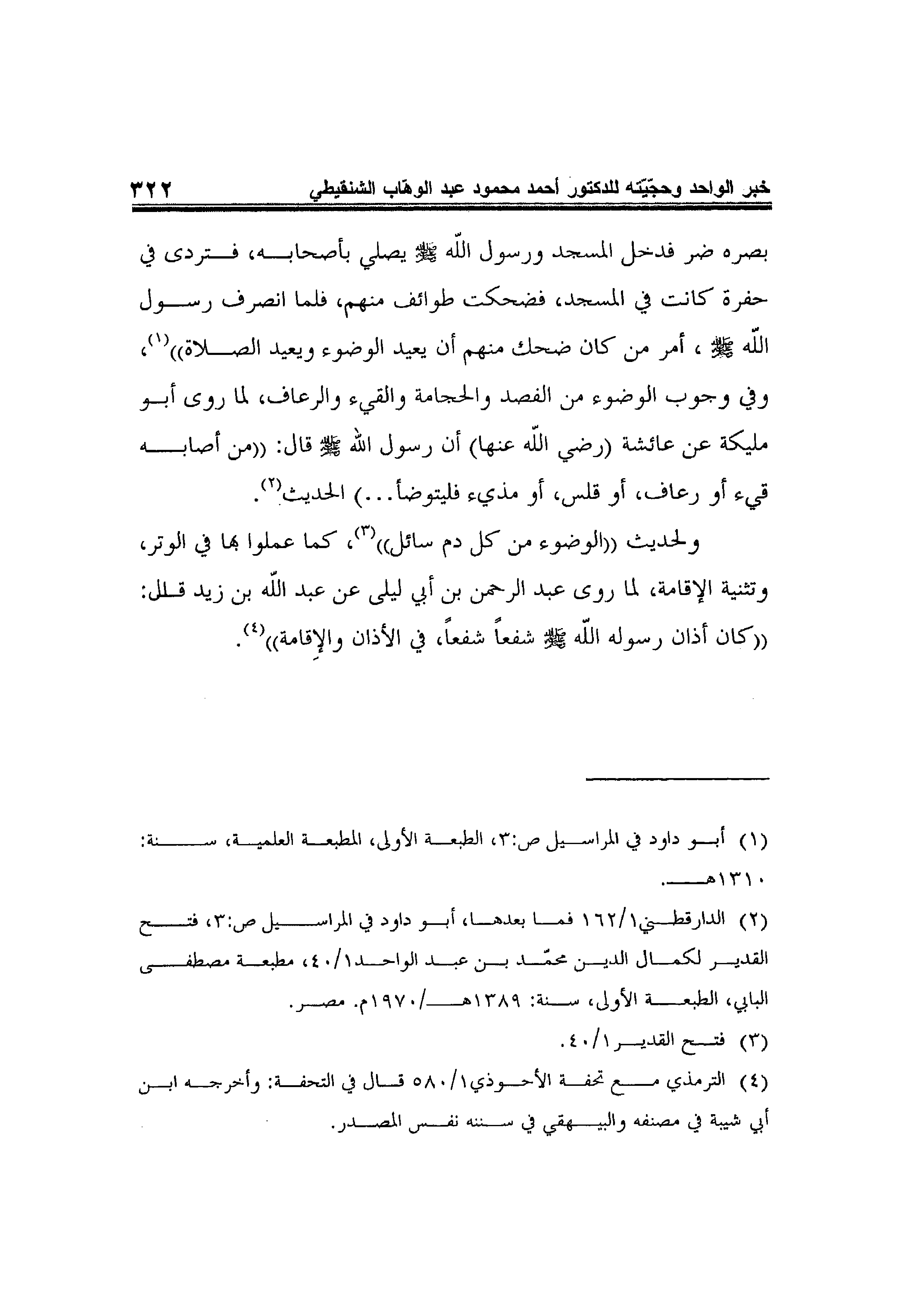 ولحديث " الوضوء من كل دم سائل" 3،كما عملوا بها في الوتر، وتثنية الإقامة، لما روى عبد الرحمن بن أبي ليلى عن عبد الله بن زيد قال: " كان أذان رسوله الله صلى الله عليه وسلم شفعاً شفعاً، في الأذان والإِقامة" 4.