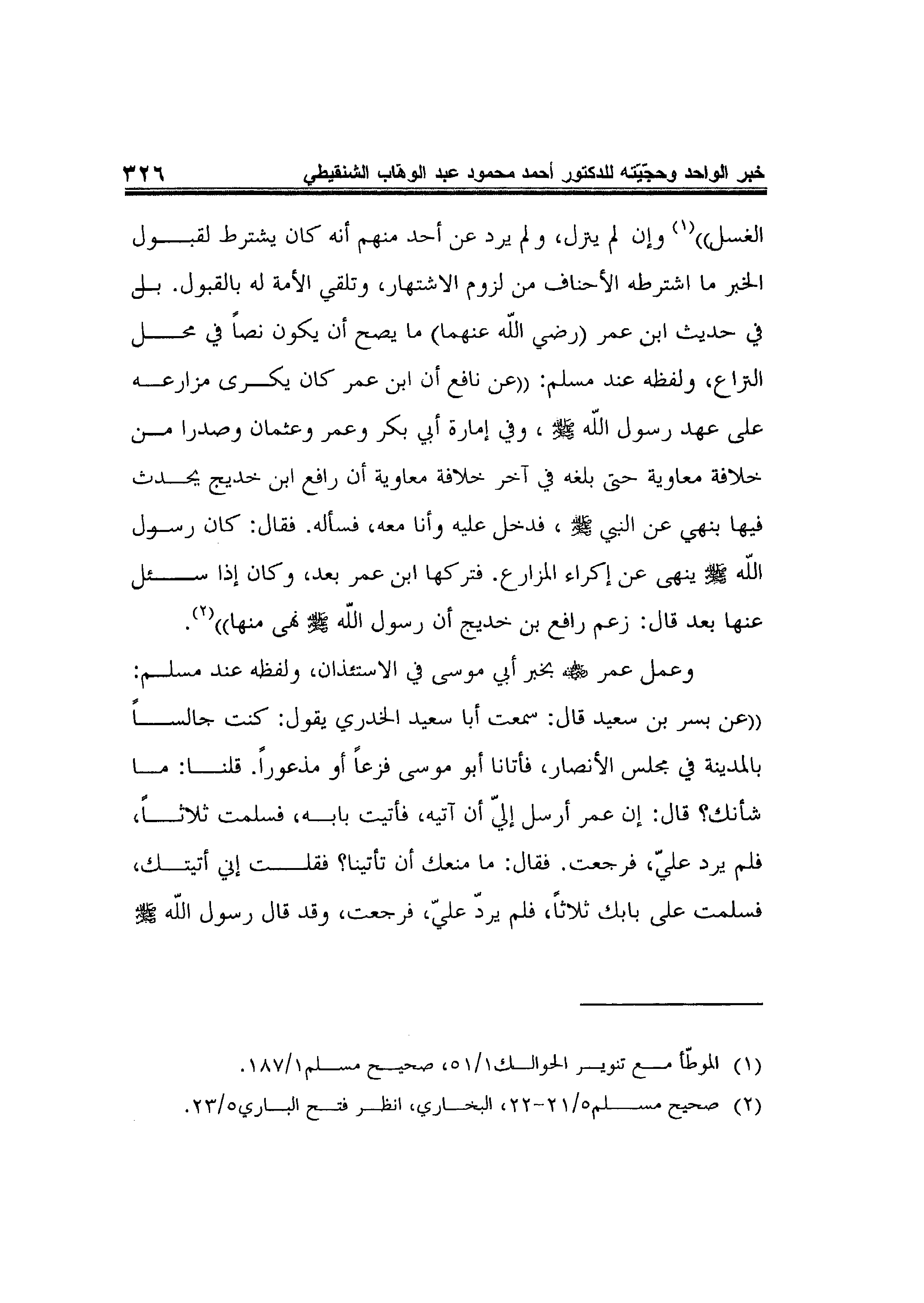 الغسل" 1 وإن لم ينزل، ولم يرد عن أحد منهم أنه كان يشترط لقبول الخبر ما اشترطه الأحناف من لزوم الاشتهار، وتلقي الأمة له بالقبول. بل في حديث ابن عمر -رضي الله عنهما- ما يصح أن يكون نصاً في محل النزاع، ولفظه عند مسلم: "عن نافع أن ابن عمر كان يكرى مزارعه على عهد رسول الله صلى الله عليه وسلم،وفي إمارة أبي بكر وعمر وعثمان وصدرا من خلافة معاوية حتى بلغه في آخر خلافة معاوية أن رافع ابن خديج يحدث فيها بنهي عن النبي صلى الله عليه وسلم،فدخل عليه وأنا معه، فسأله. فقال: "كان رسول الله صلى الله عليه وسلم ينهى عن إكراء المزارع ". فتركها ابن عمر بعد، وكان إذا سئل عنها بعد قال: "زعم رافع بن خديج أن رسول الله صلى الله عليه وسلم نهى منها"2.