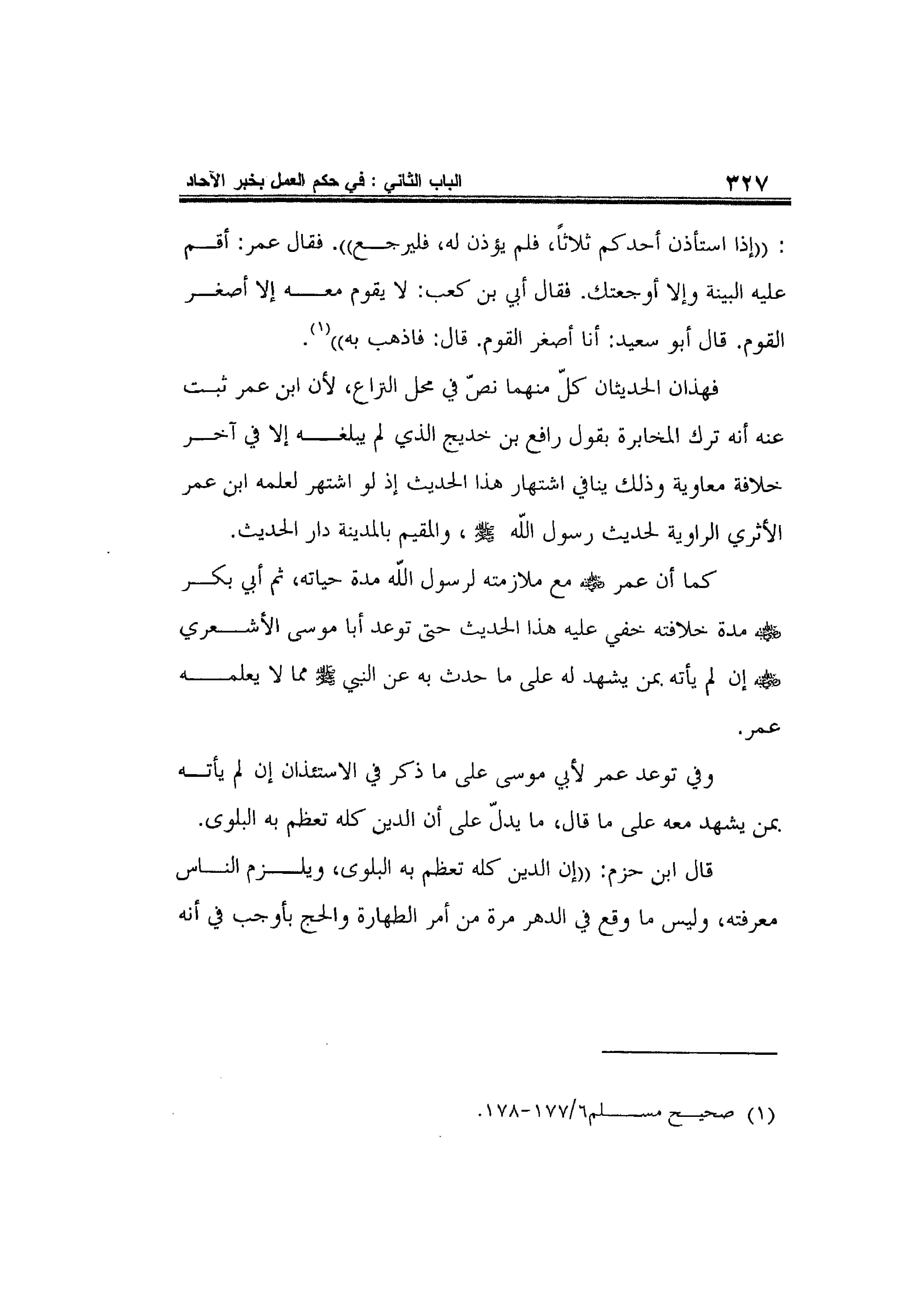 كما أن عمر رضي الله عنه مع ملازمته لرسول الله مدة حياته، ثم أبي بكر رضي الله عنه مدة خلافته خفي عليه هذا الحديث حتى توعد أبا موسى الأشعري رضي الله عنه إن لم يأته بمن يشهد له على ما حدث به عن النبي صلى الله عليه وسلم مما لا يعلمه عمر. وفي توعد عمر لأبي موسى على ما ذكر في الاستئذان إن لم يأته بمن يشهد معه على ما قال، ما يدلّ على أن الدين كله تعظم به البلوى.