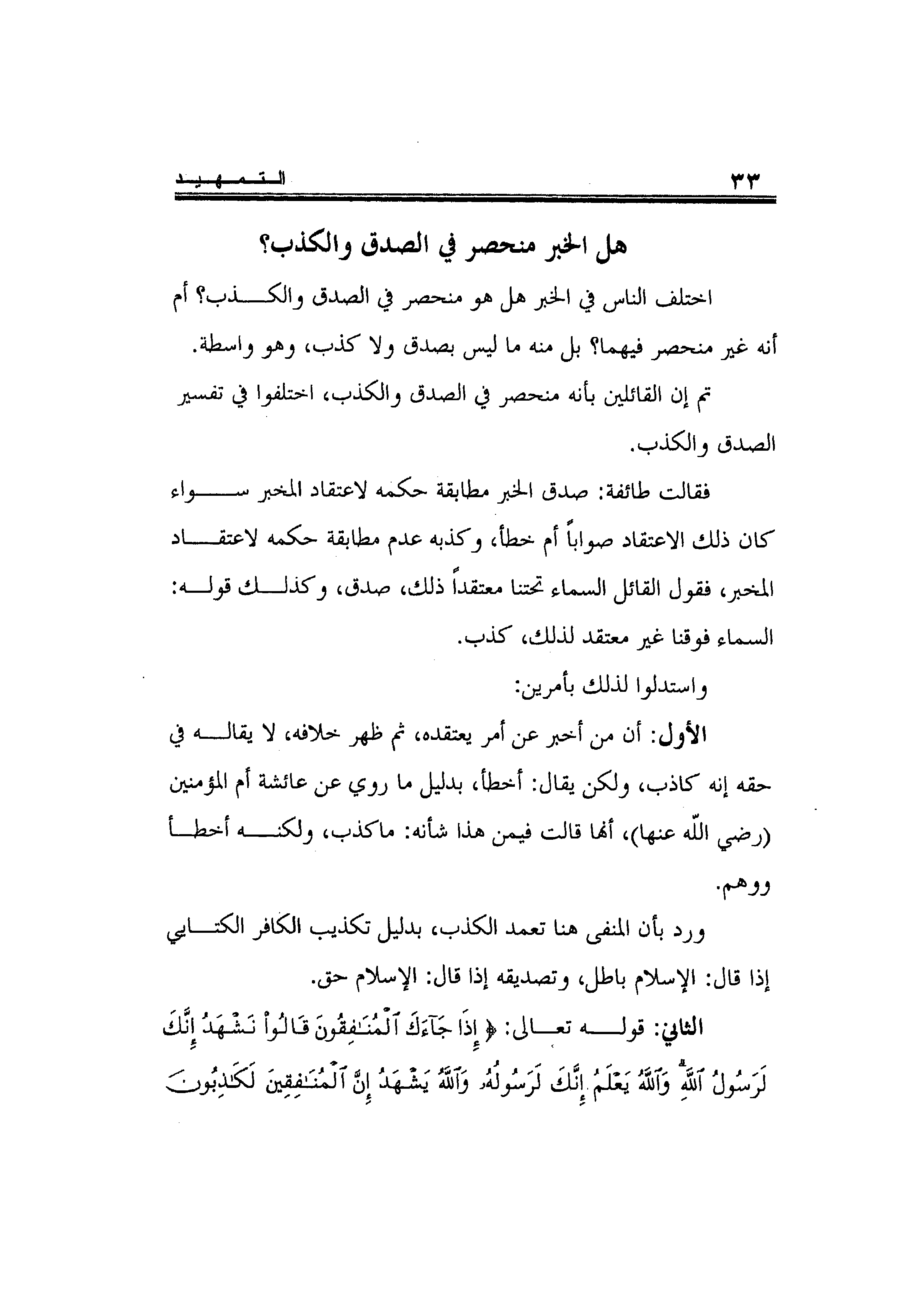 اختلف الناس في الخبر هل هو منحصر في الصدق والكذب؟ أم أنه غير منحصر فيهما؟ بل منه ما ليس بصدق ولا كذب، وهو واسطة. تم إن القائلين بأنه منحصر في الصدق والكذب، اختلفوا في تفسير الصدق والكذب.