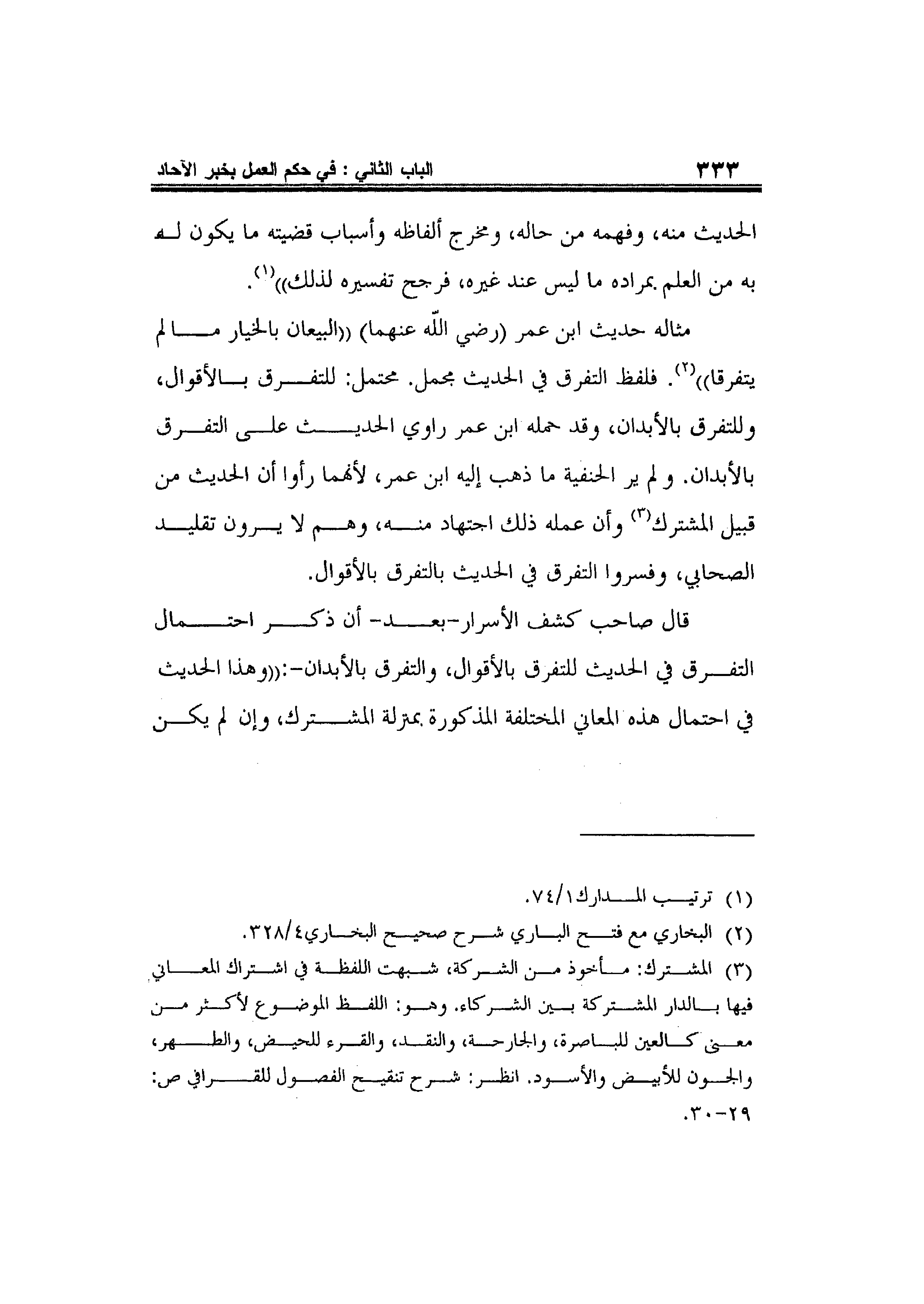 قال صاحب كشف الأسرار بعد أن ذكر احتمال التفرق في الحديث للتفرق بالأقوال، والتفرق بالأبدان: "وهذا الحديث في احتمال هذه المعاني المختلفة المذكورة بمنزلة المشترك، وإن لم يكن
