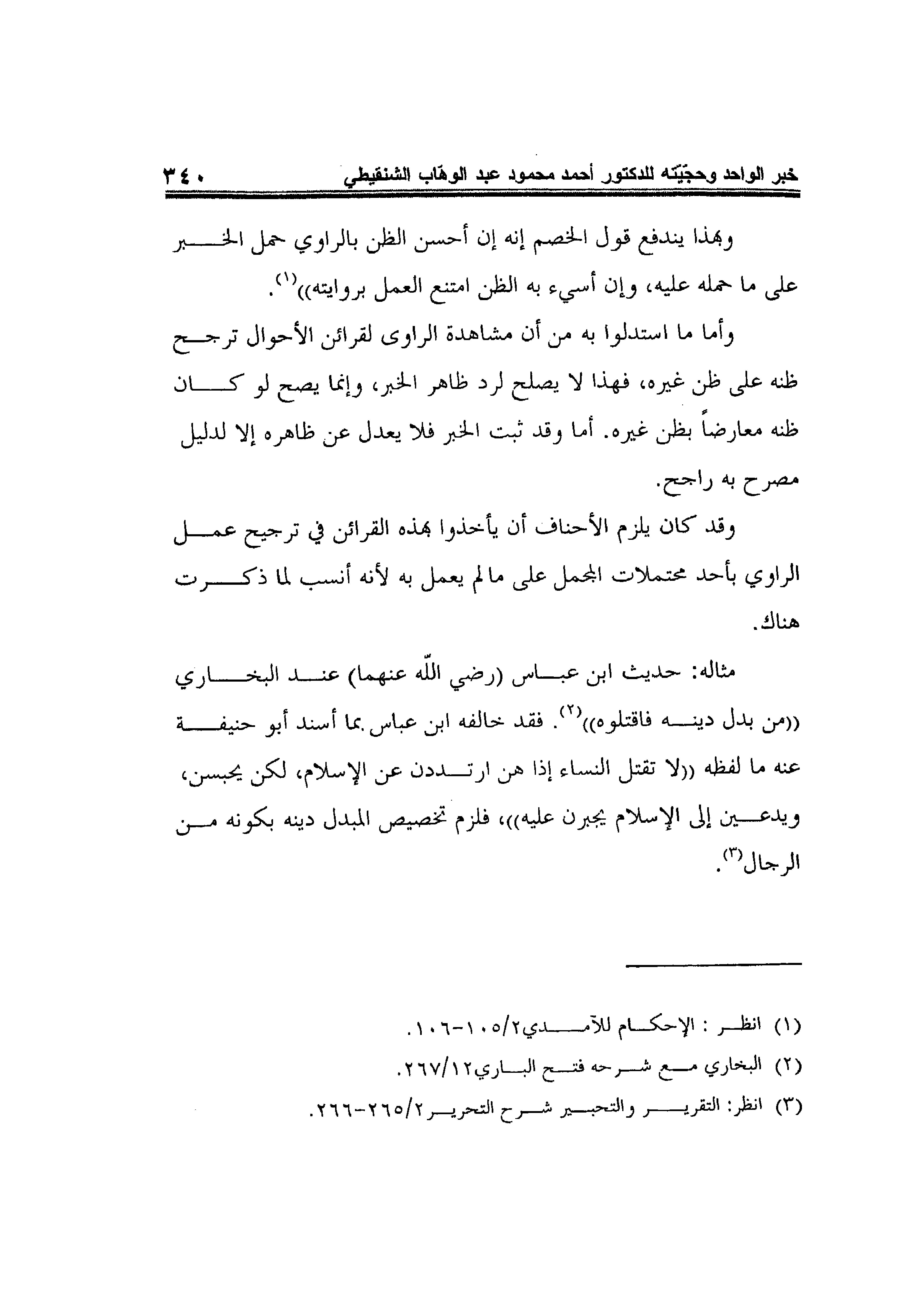وأما ما استدلوا به من أن مشاهدة الراوى لقرائن الأحوال ترجح ظنه على ظن غيره، فهذا لا يصلح لرد ظاهر الخبر، وإنما يصح لو كان ظنه معارضاً بظن غيره. أما وقد ثبت الخبر فلا يعدل عن ظاهره إلا لدليل مصرح به راجح. وقد كان يلزم الأحناف أن يأخذوا بهذه القرائن في ترجيح عمل الراوي بأحد محتملات المجمل على مالم يعمل به لأنه أنسب لما ذكرت هناك.