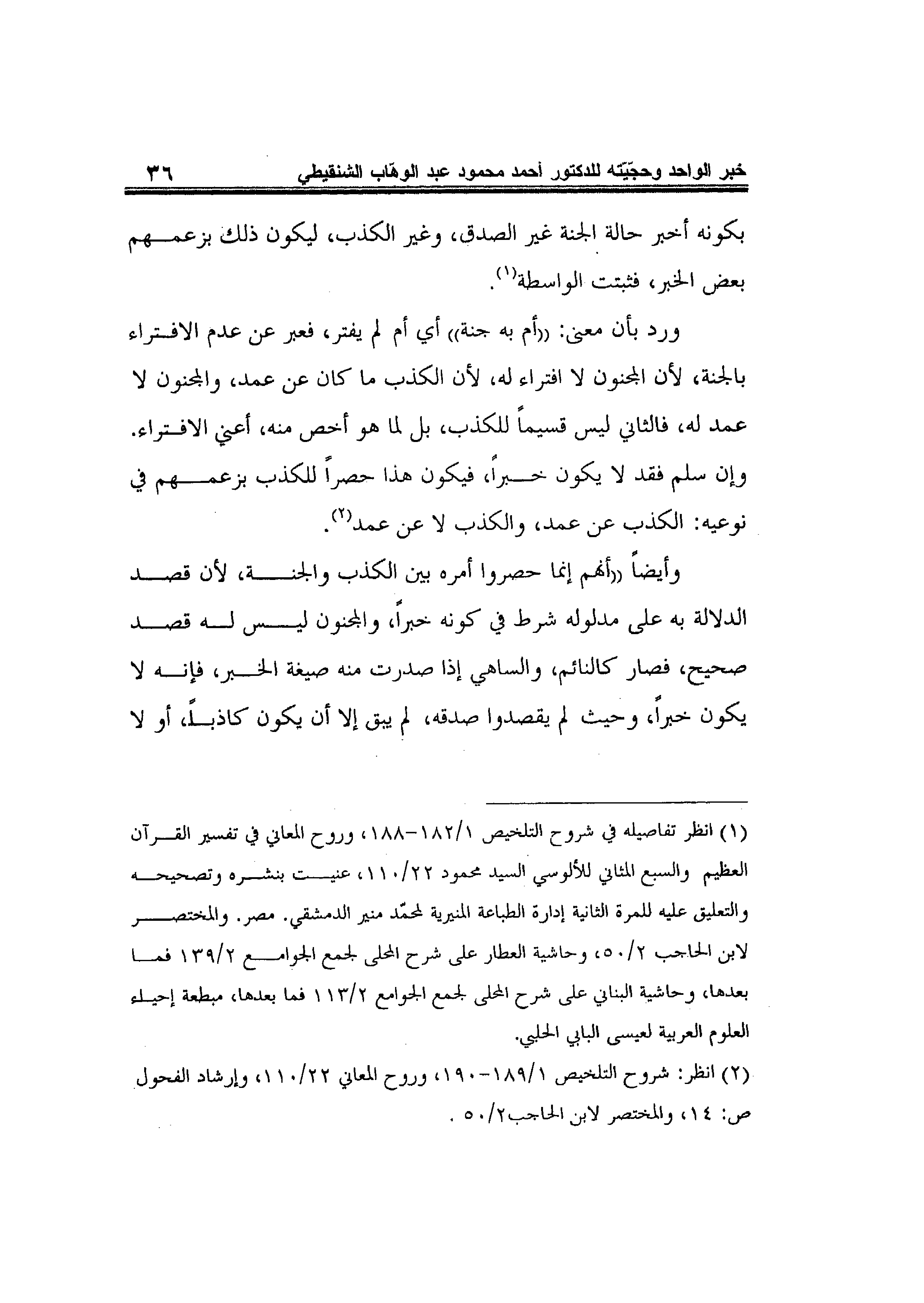 وأيضا ً"أنهم إنما حصروا أمره بين الكذب والجنة، لأن قصد الدلالة به على مدلوله شرط في كونه خبراً، والمجنون ليس له قصد صحيح، فصار كالنائم، والساهي إذا صدرت منه صيغة الخبر، فإنه لا يكون خبراً، وحيث لم يقصدوا صدقه، لم يبق إلا أن يكون كاذباً، أو لا