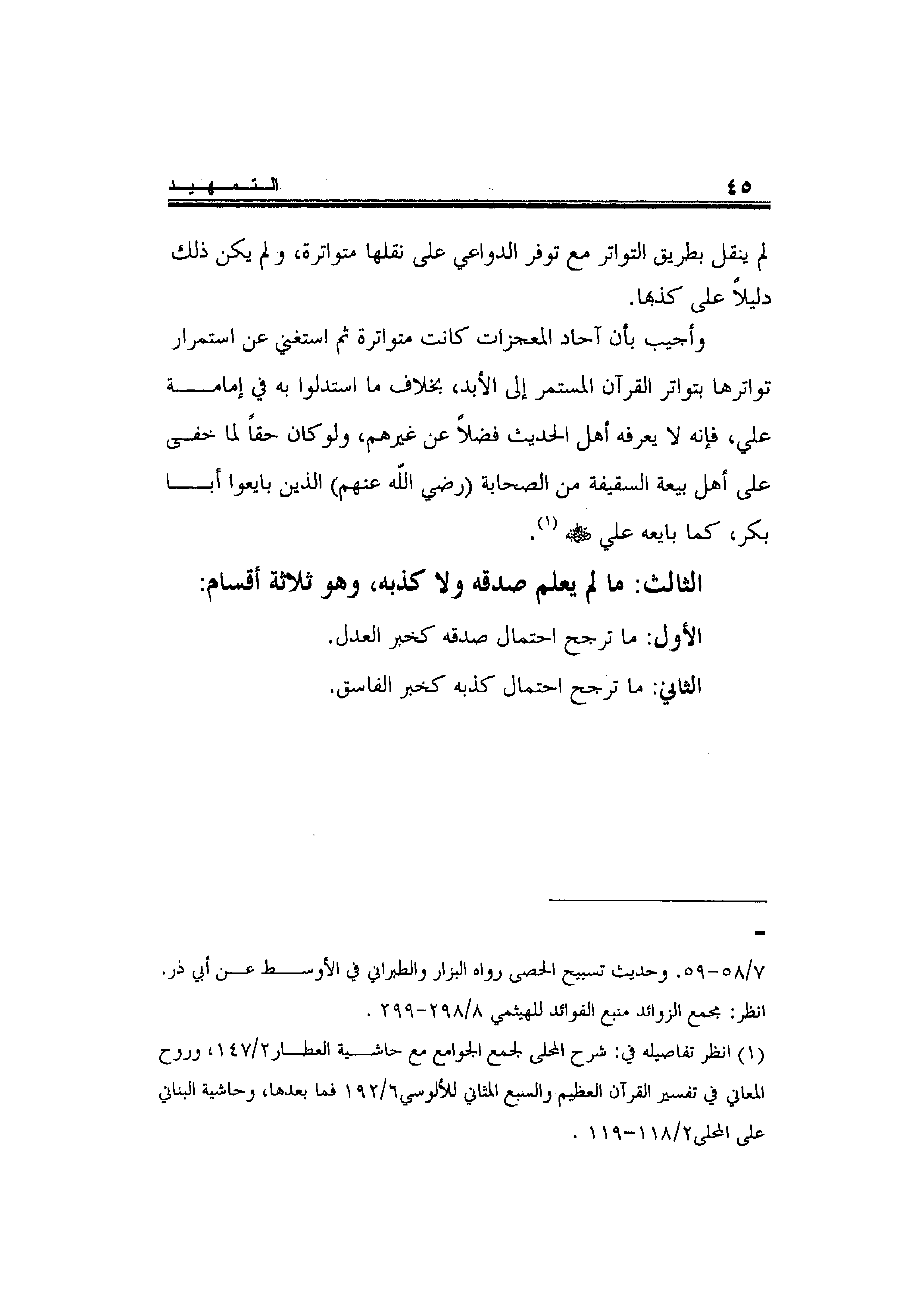 وأجيب بأن آحاد المعجزات كانت متواترة ثم استغني عن استمرار تواترها بتواتر القرآن المستمر إلى الأبد، بخلاف ما استدلوا به في إمامة علي، فإنه لا يعرفه أهل الحديث فضلاً عن غيرهم، ولوكان حقاً لما خفى على أهل بيعة السقيفة من الصحابة رضي الله عنهم الذين بايعوا أبا بكر، كما بايعه علي رضي الله عنه1.