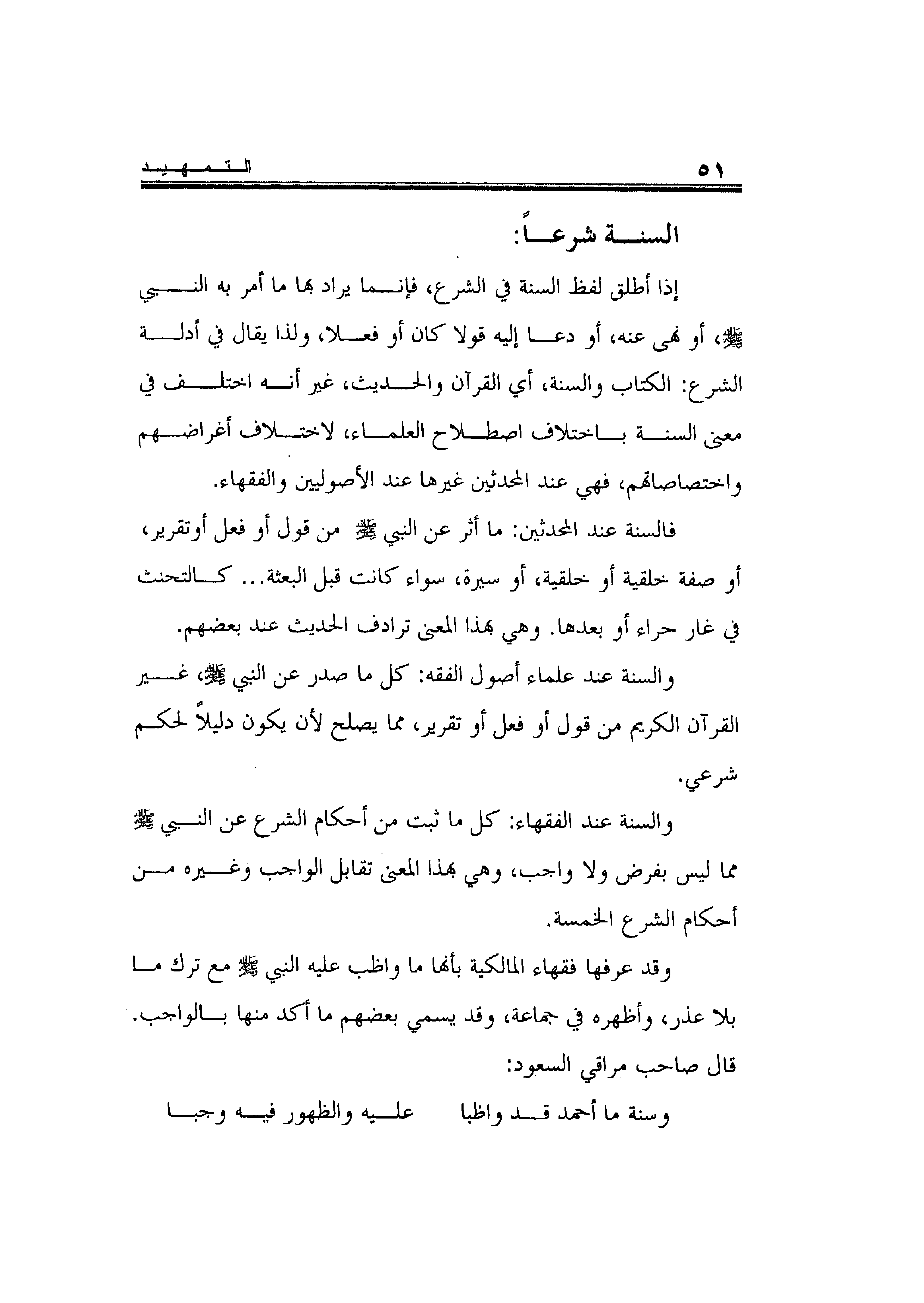 والسنة عند الفقهاء: كل ما ثبت من أحكام الشرع عن النبي صلى الله عليه وسلم مما ليس بفرض ولا واجب، وهي بهذا المعنى تقابل الواجب وغيره من أحكام الشرع الخمسة.