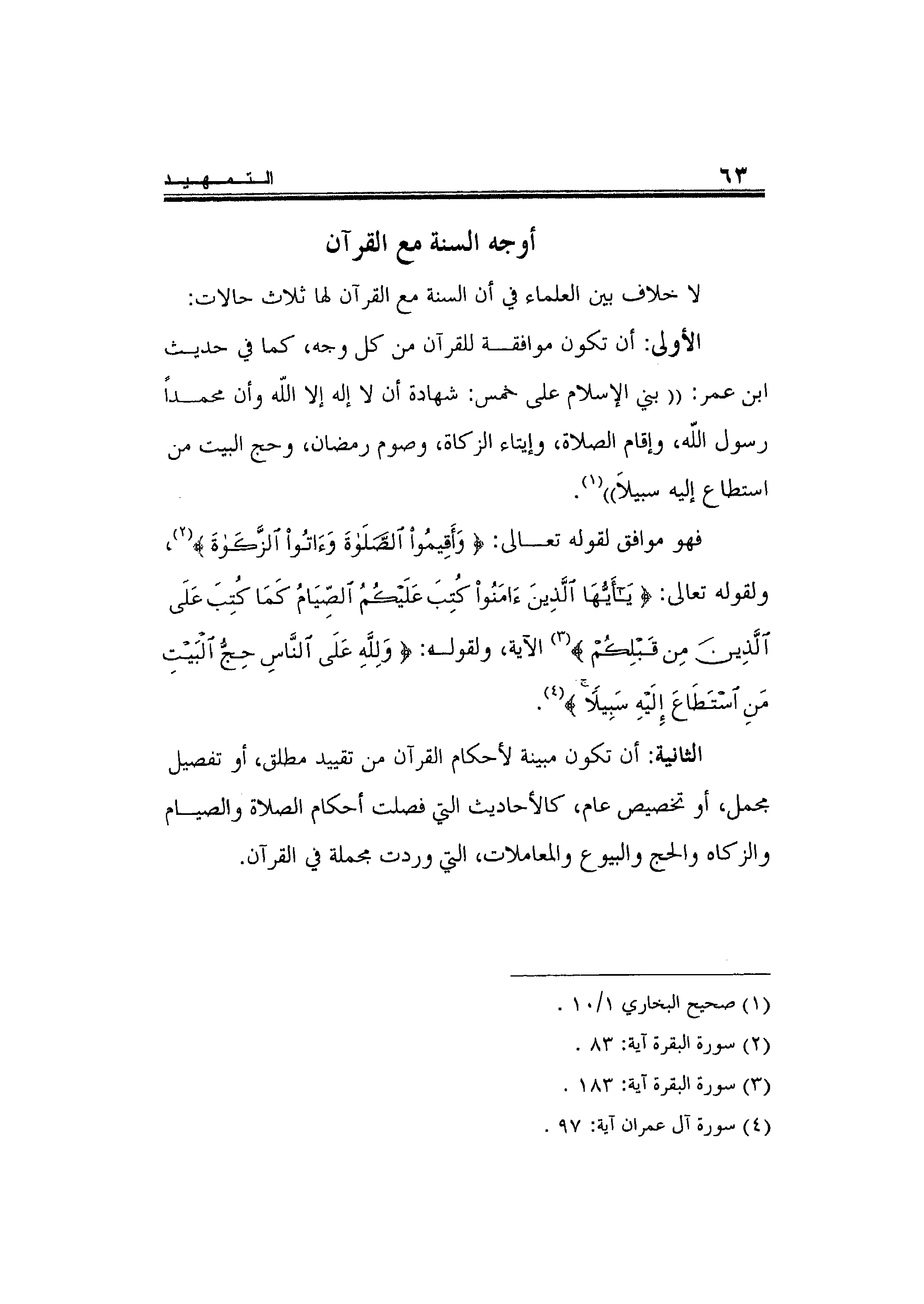 الأولى: أن تكون موافقة للقرآن من كل وجه، كما في حديث ابن عمر: "بني الإسلام على خمس: شهادة أن لا إله إلا الله وأن محمداً رسول الله، وإقام الصلاة، وإيتاء الزكاة، وصوم رمضان، وحج البيت من استطاع إليه سبيلاَ"1.