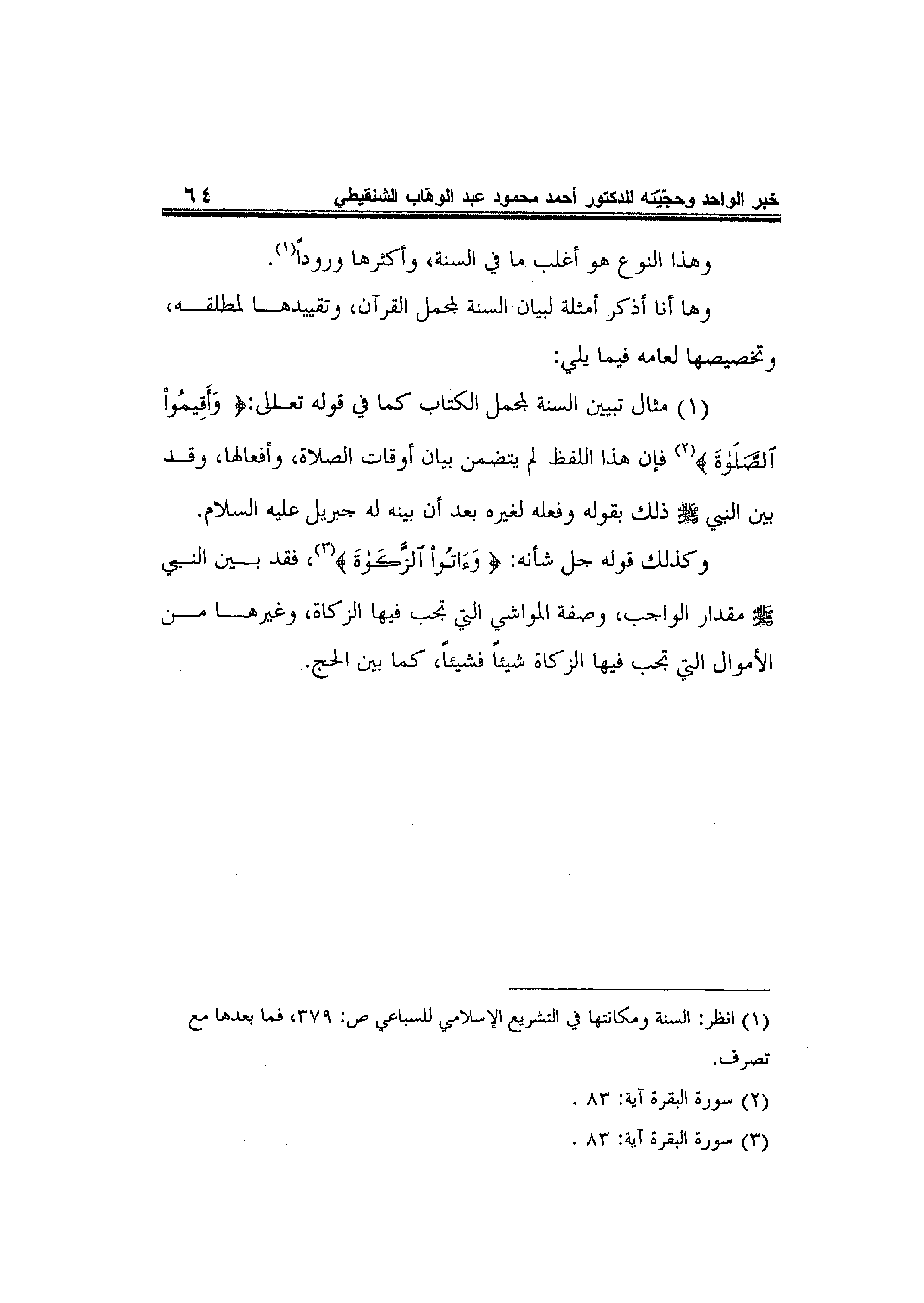 1- مثال تبيين السنة لمجمل الكتاب كما في قوله تعالى: {وَأَقِيمُوا الصَّلاةَ} 2 فإن هذا اللفظ لم يتضمن بيان أوقات الصلاة، وأفعالها، وقد بين النبي صلى الله عليه وسلم ذلك بقوله وفعله لغيره بعد أن بينه له جبريل عليه السلام. وكذلك قوله جل شأنه: {وَآتُوا الزَّكَاةَ} 3، فقد بين النبي صلى الله عليه وسلم مقدار الواجب، وصفة المواشي التي تجب فيها الزكاة، وغيرها من الأموال التي تجب فيها الزكاة شيئاً فشيئاً، كما بين الحج.