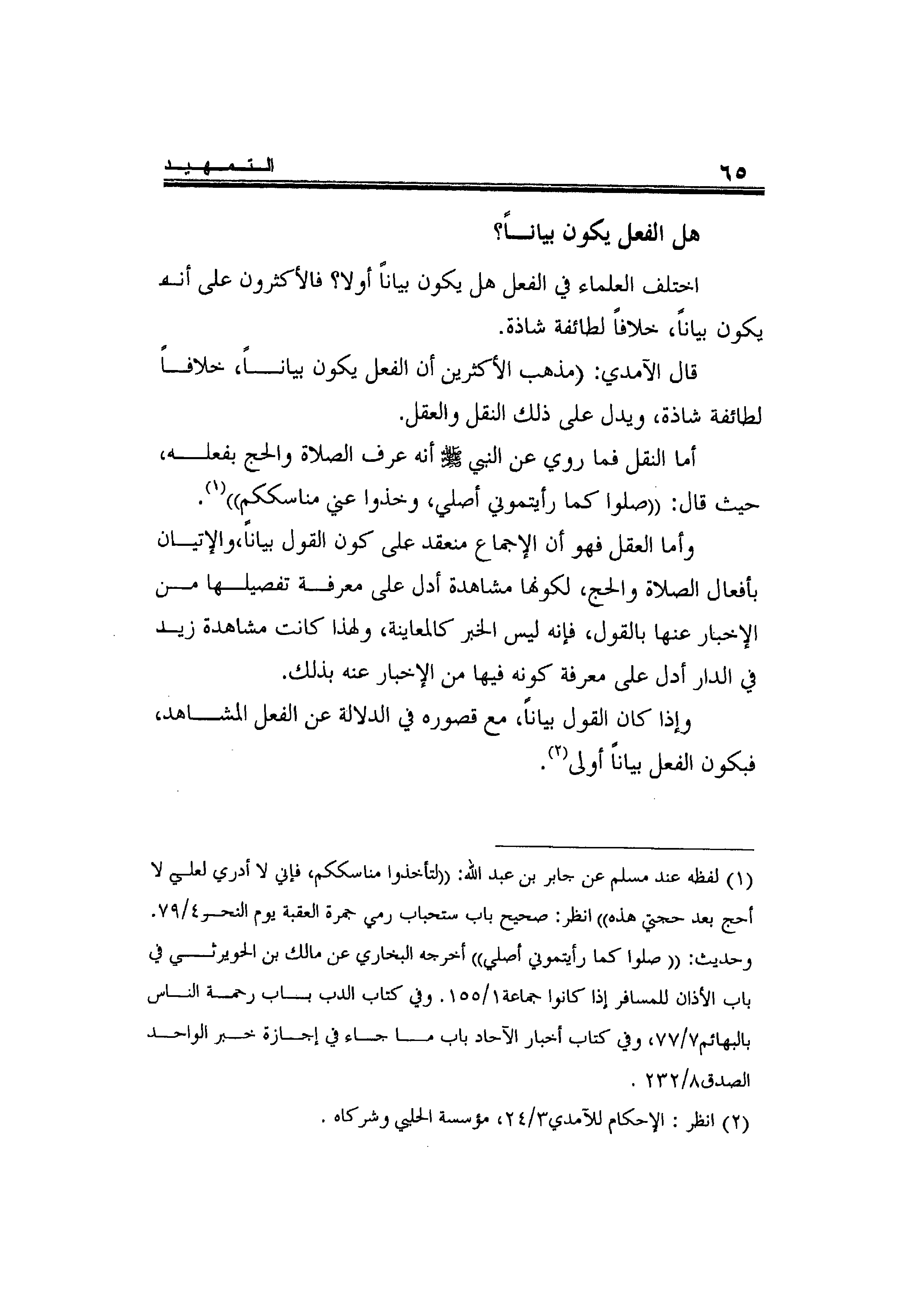 قال الآمدي: "مذهب الأكثرين أن الفعل يكون بياناً، خلافاً لطائفة شاذة، ويدل على ذلك النقل والعقل. أما النقل فما روي عن النبي صلى الله عليه وسلم أنه عرف الصلاة والحج بفعله، حيث قال: "صلوا كما رأيتموني أصلي، وخذوا عني مناسككم" 1.
