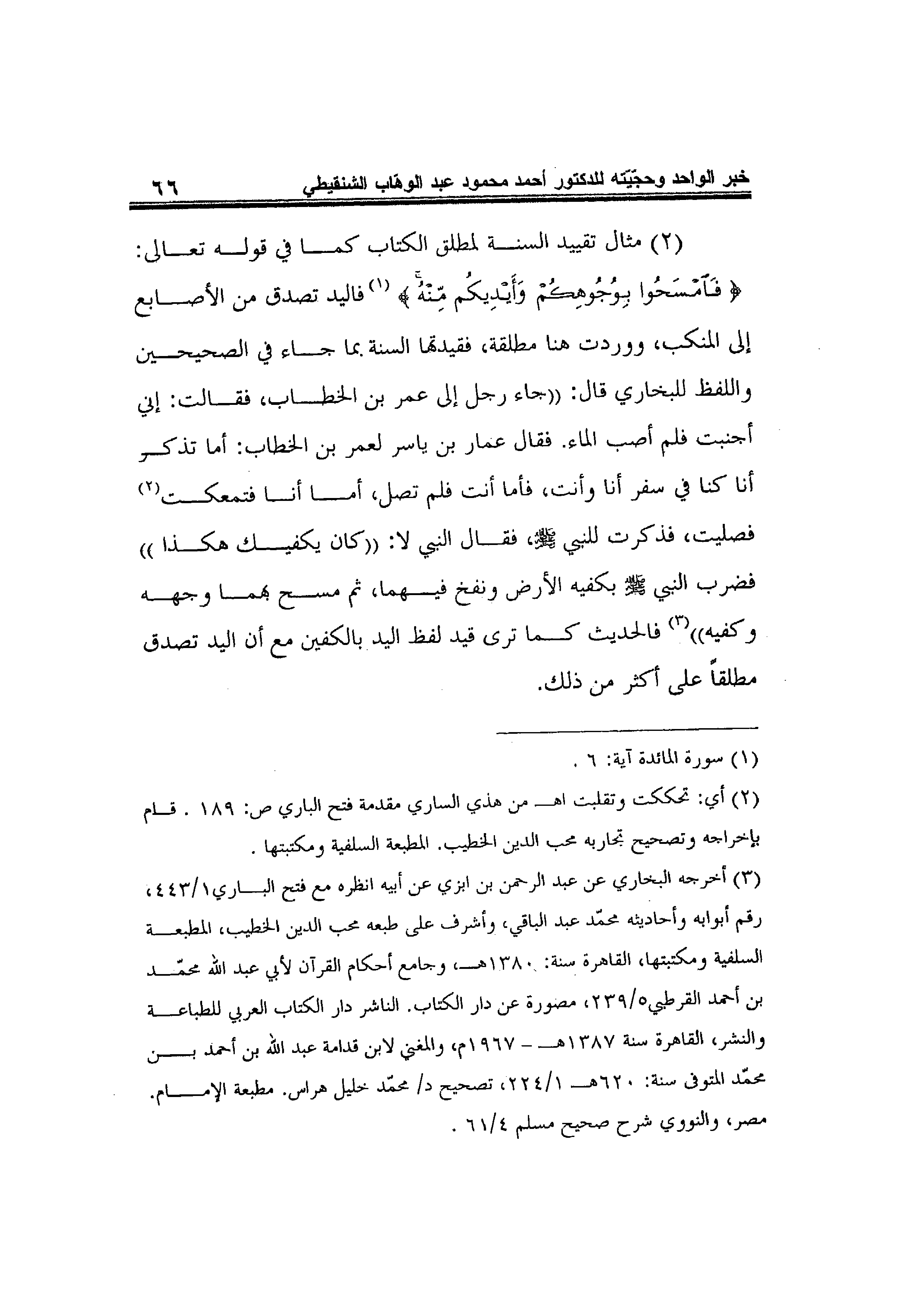 2- مثال تقييد السنة لمطلق الكتاب كما في قوله تعالى: {فَامْسَحُوا بِوُجُوهِكُمْ وَأَيْدِيكُمْ مِنْهُ} 1 فاليد تصدق من الأصابع إلى المنكب، ووردت هنا مطلقة، فقيدتها السنة بما جاء في الصحيحين واللفظ للبخاري قال: "جاء رجل إلى عمر بن الخطاب، فقالت: إني أجنبت فلم أصب الماء. فقال عمار بن ياسر لعمر بن الخطاب: أما تذكر أنا كنا في سفر أنا وأنت، فأما أنت فلم تصل، أما أنا فتمعكت2 فصليت، فذكرت للنبي صلى الله عليه وسلم، فقال النبي لا: "كان يكفيك هكذا " فضرب النبي صلى الله عليه وسلم بكفيه الأرض ونفخ فيهما، ثم مسح بهما وجهه وكفيه" 3 فالحديث كما ترى قيد لفظ اليد بالكفين مع أن اليد تصدق مطلقاً على أكثر من ذلك.