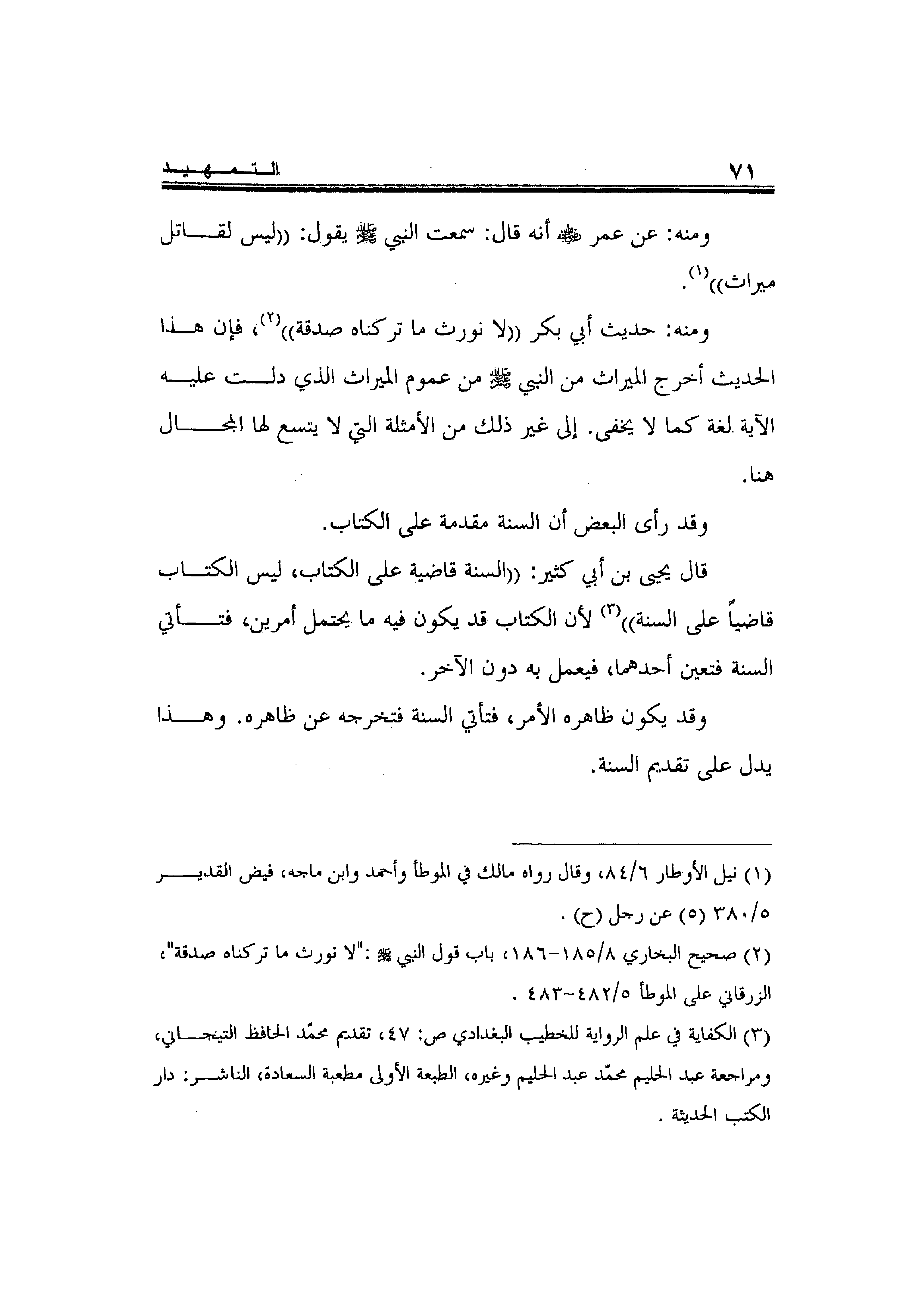 ومنه: حديث أبي بكر: "لا نورث ما تركناه صدقة" 2، فإن هذا الحديث أخرج الميراث من النبي صلى الله عليه وسلم من عموم الميراث الذي دلت عليه الآية لغة كما لا يخفى. إلى غير ذلك من الأمثلة التي لا يتسع لها المجال هنا. وقد رأى البعض أن السنة مقدمة على الكتاب.