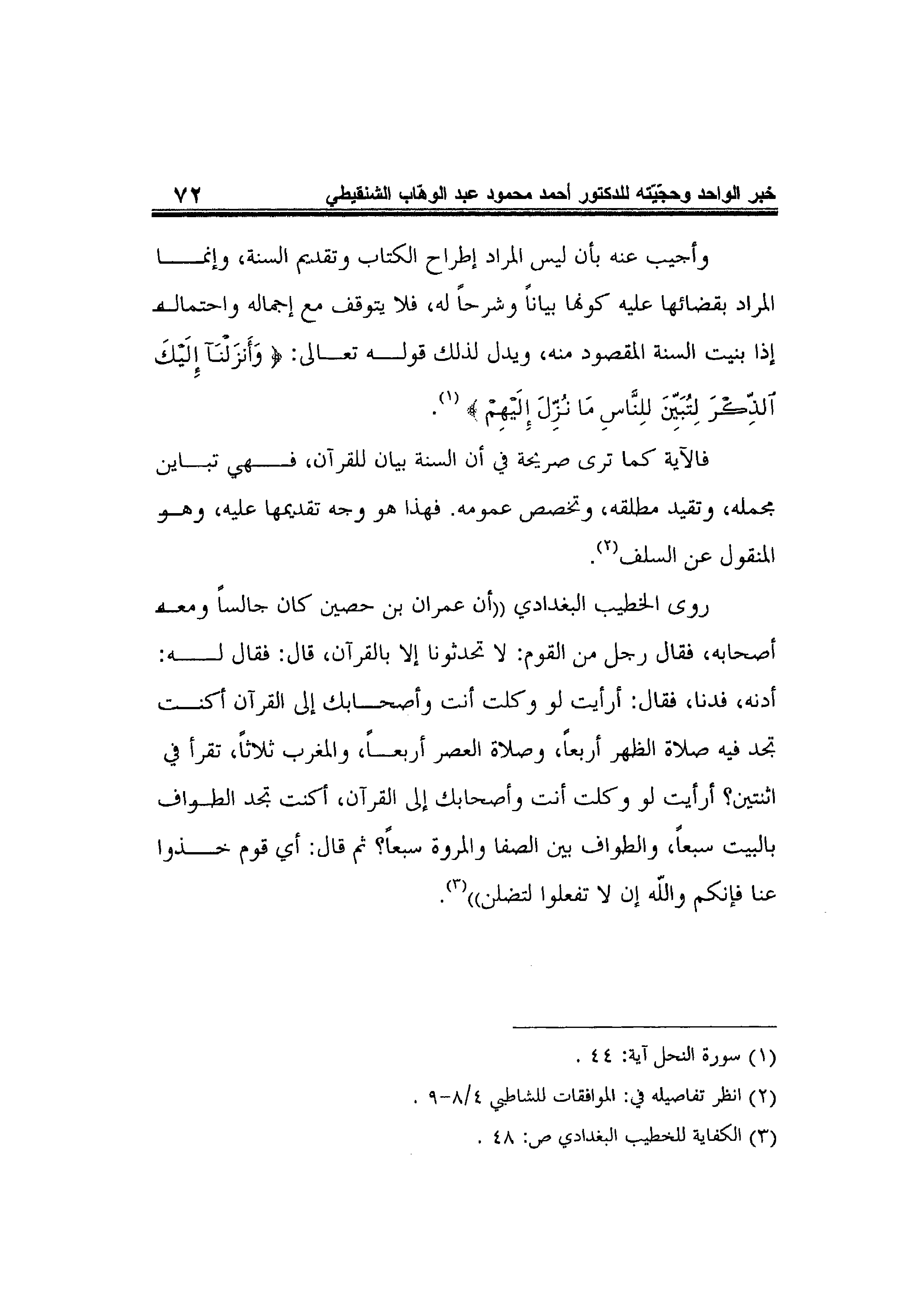 روى الخطيب البغدادي: "أن عمران بن حصين كان جالساً ومعه أصحابه، فقال رجل من القوم: لا تحدثونا إلا بالقرآن، قال: فقال له: أدنه، فدنا، فقال: أرأيت لو وكلت أنت وأصحابك إلى القرآن أكنت تجد فيه صلاة الظهر أربعاً، وصلاة العصر أربعاً، والمغرب ثلاثاً، تقرأ في اثنتين؟ أرأيت لو وكلت أنت وأصحابك إلى القرآن، أكنت تجد الطواف بالبيت سبعاً، والطواف بين الصفا والمروة سبعاً؟ ثم قال: أي قوم خذوا عنا فإنكم والله إن لا تفعلوا لتضلن"3.