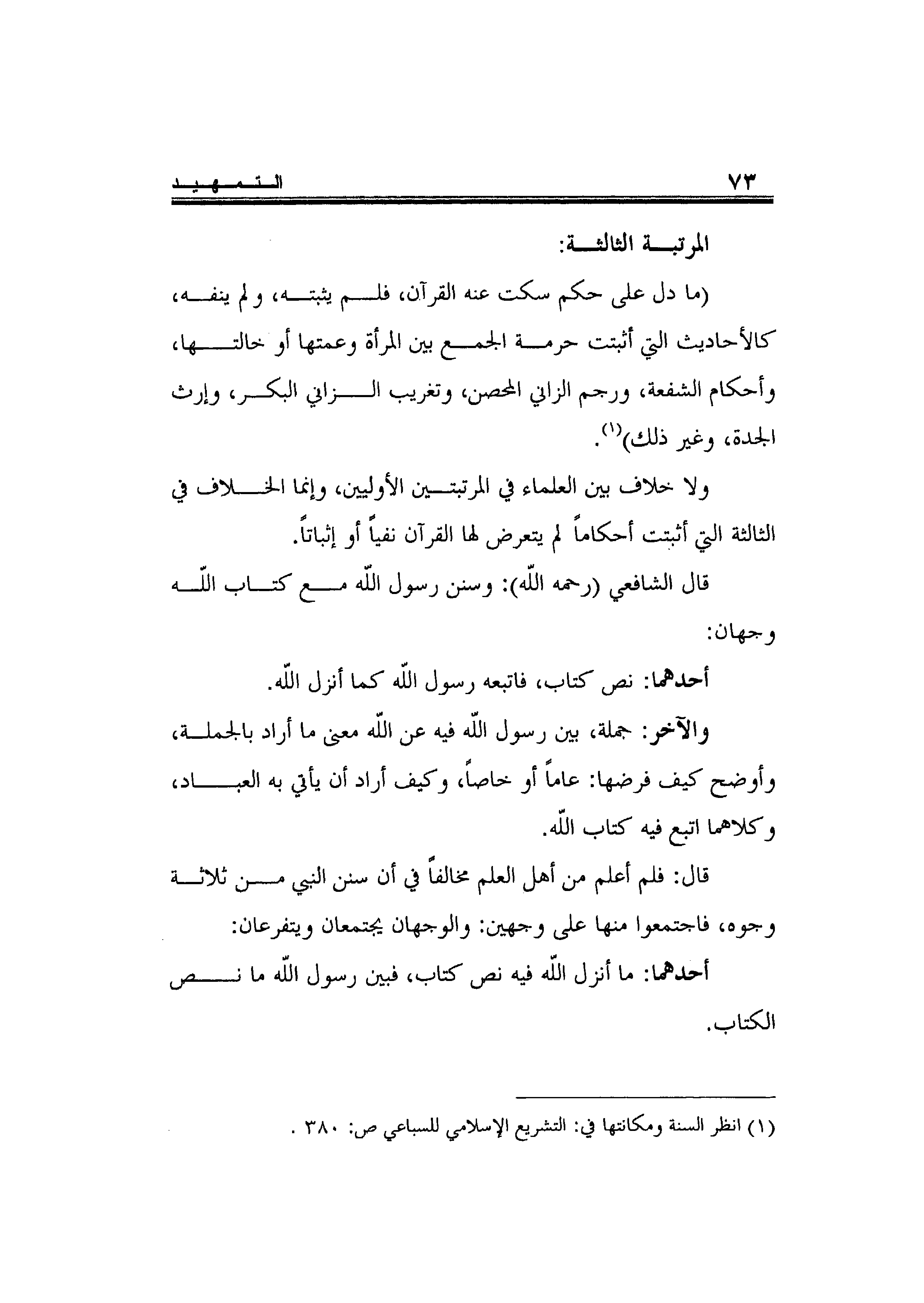 ولا خلاف بين العلماء في المرتبتين الأوليين، وإنما الخلاف في الثالثة التي أثبتت أحكاماً لم يتعرض لها القرآن نفياً أو إثباتاً. قال الشافعي -رحمه الله-: " وسنن رسول الله مع كتاب الله وجهان: