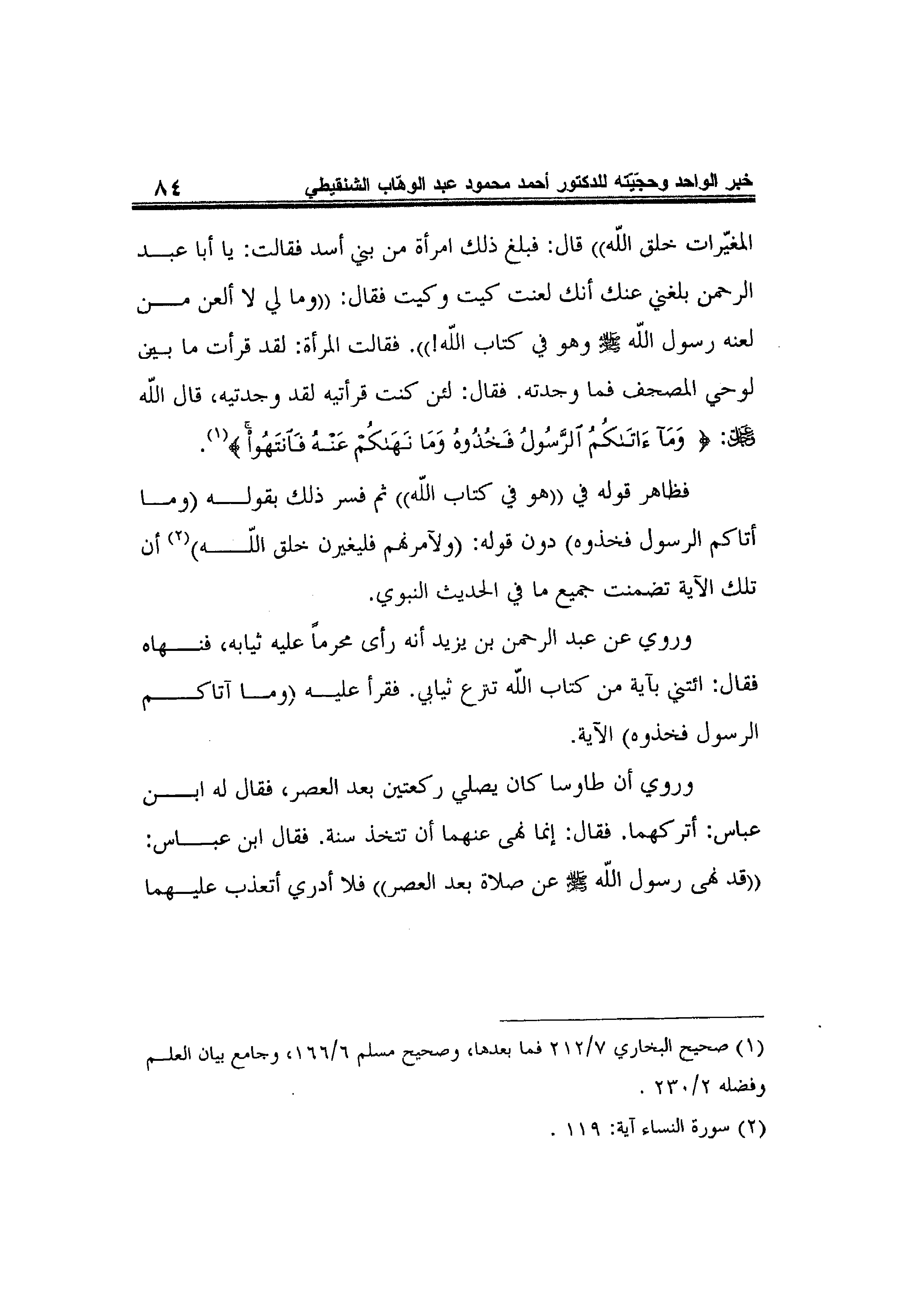 المغيّرات خلق الله" قال: "فبلغ ذلك امرأة من بني أسد" فقالت: "يا أبا عبد الرحمن بلغني عنك أنك لعنت كيت وكيت" فقال: "وما لي لا ألعن من لعنه رسول الله صلى الله عليه وسلم وهو في كتاب الله! ". فقالت المرأة: "لقد قرأت ما بين لوحي المصحف فما وجدته". فقال: "لئن كنت قرأتيه لقد وجدتيه"،قال الله عز وجل: {وَمَا آتَاكُمُ الرَّسُولُ فَخُذُوهُ وَمَا نَهَاكُمْ عَنْهُ فَانْتَهُوا} 1.