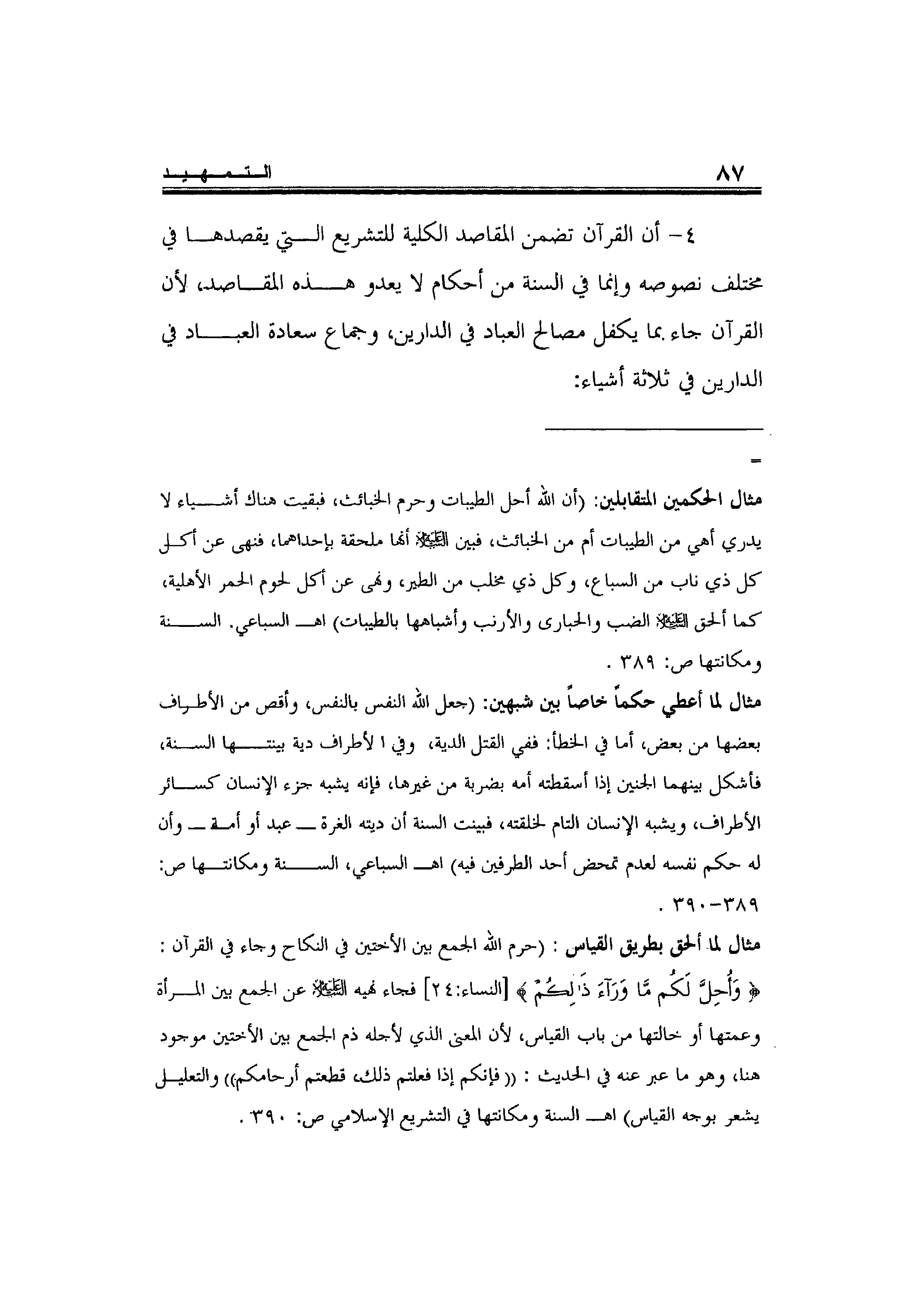 4- أن القرآن تضمن المقاصد الكلية للتشريع التي يقصدها في مختلف نصوصه وإنما في السنة من أحكام لا يعدو هذه المقاصد، لأن القرآن جاء بما يكفل مصالح العباد في الدارين، وجماع سعادة العباد في الدارين في ثلاثة أشياء: