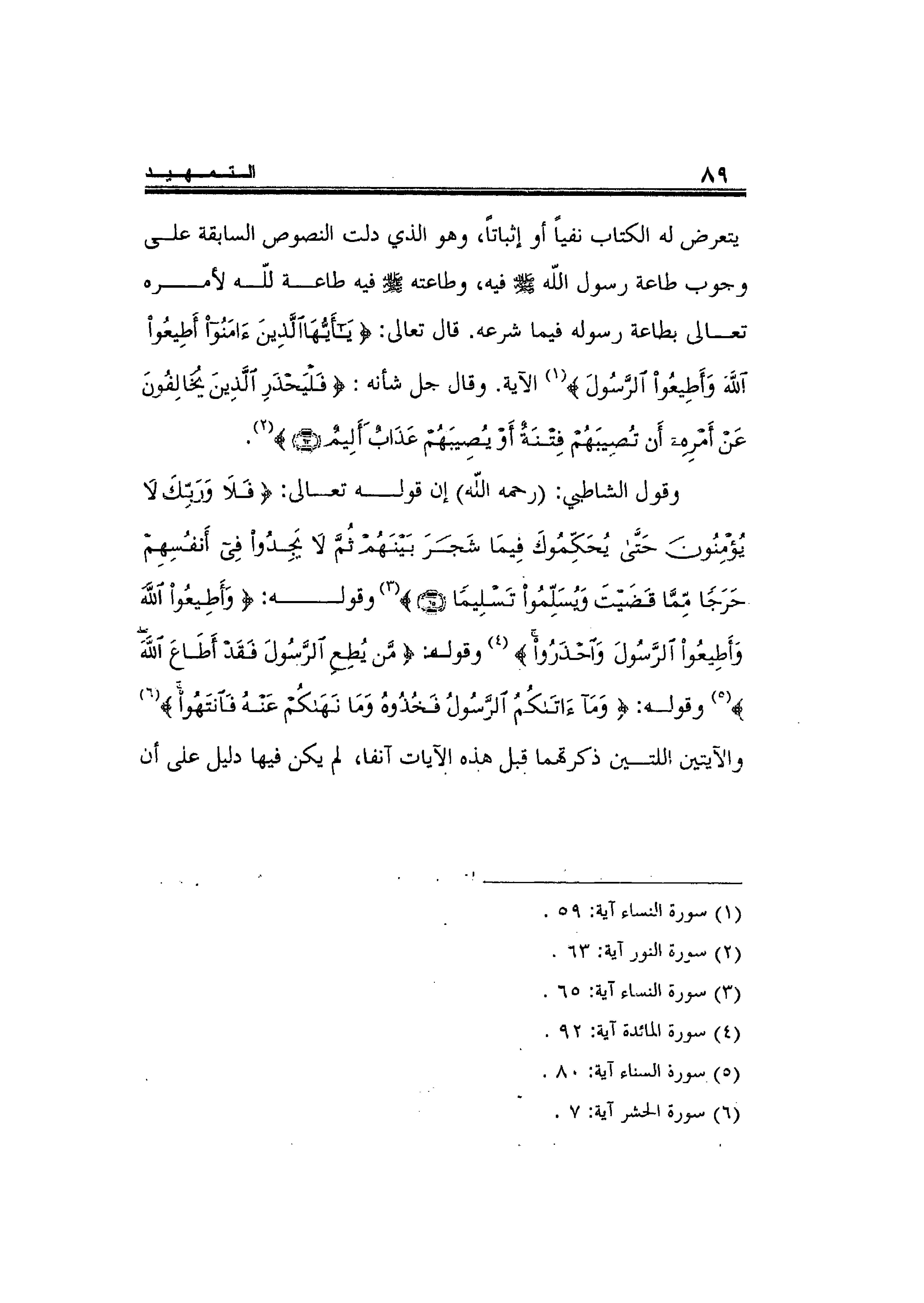 وقول الشاطبي: -رحمه الله- إن قوله تعالى: {فَلا وَرَبِّكَ لا يُؤْمِنُونَ حَتَّى يُحَكِّمُوكَ فِيمَا شَجَرَ بَيْنَهُمْ ثُمَّ لا يَجِدُوا فِي أَنْفُسِهِمْ حَرَجاً مِمَّا قَضَيْتَ وَيُسَلِّمُوا تَسْلِيماً} 3 وقوله: {وَأَطِيعُوا اللَّهَ وَأَطِيعُوا الرَّسُولَ وَاحْذَرُوا} 4 وقوله: {مَنْ يُطِعِ الرَّسُولَ فَقَدْ أَطَاعَ اللَّهَ} 5 وقوله: {وَمَا آتَاكُمُ الرَّسُولُ فَخُذُوهُ وَمَا نَهَاكُمْ عَنْهُ فَانْتَهُوا} 6 والآيتين اللتين ذكرتهما قبل هذه الآيات آنفا، لم يكن فيها دليل على أن