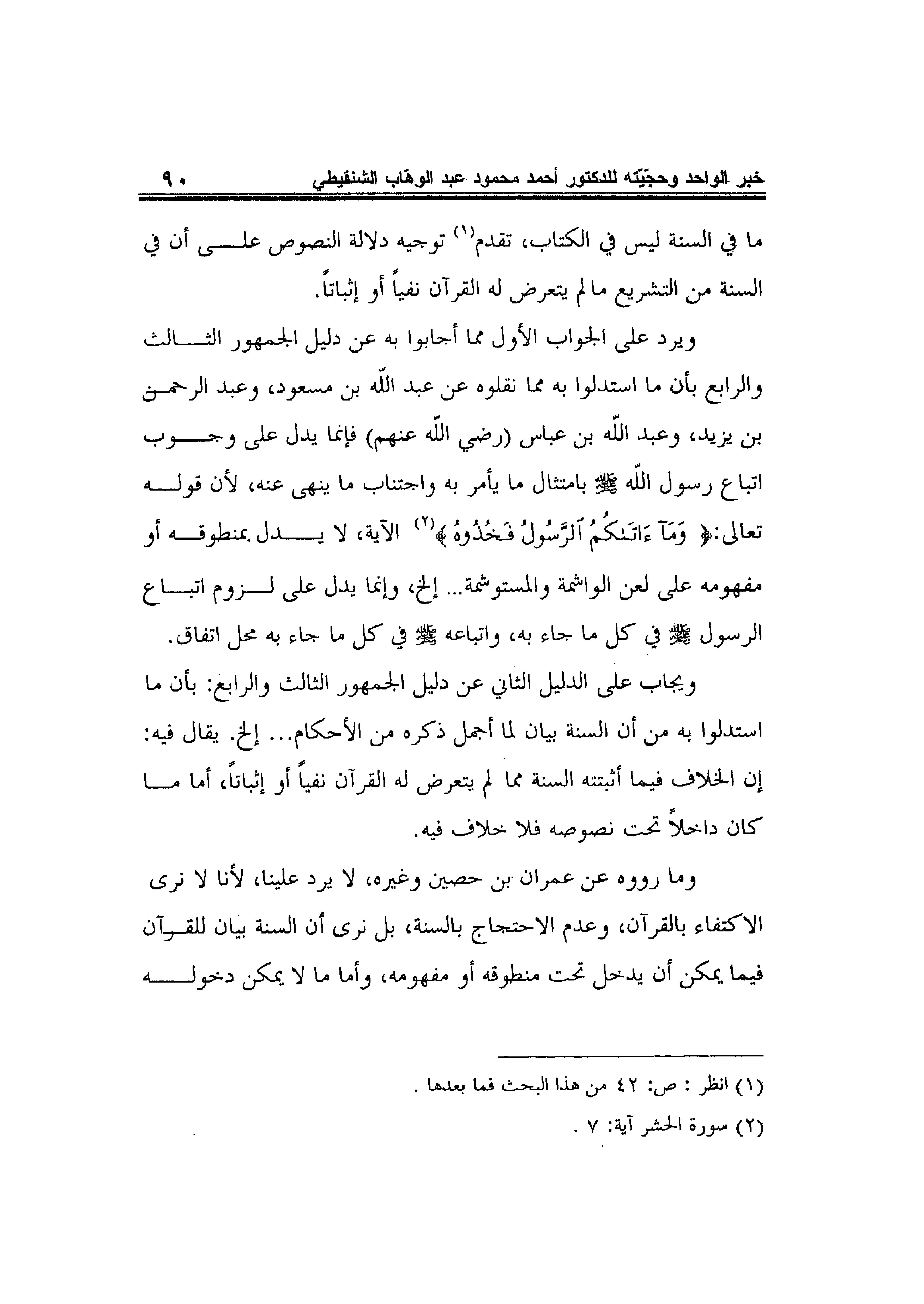 ما في السنة ليس في الكتاب، تقدم1 توجيه دلالة النصوص على أن في السنة من التشريع مالم يتعرض له القرآن نفياً أو إثباتاً. ويرد على الجواب الأول مما أجابوا به عن دليل الجمهور الثالث والرابع بأن ما استدلوا به مما نقلوه عن عبد الله بن مسعود، وعبد الرحمن بن يزيد، وعبد الله بن عباس -رضي الله عنهم- فإنما يدل على وجوب اتباع رسول الله صلى الله عليه وسلم بامتثال ما يأمر به واجتناب ما ينهى عنه، لأن قوله تعالى: {وَمَا آتَاكُمُ الرَّسُولُ فَخُذُوهُ} 2الآية، لا يدل بمنطوقه أو مفهومه على لعن الواشمة والمستوشمة… إلخ، وإنما يدل على لزوم اتباع الرسول صلى الله عليه وسلم في كل ما جاء به، واتباعه صلى الله عليه وسلم في كل ما جاء به محل اتفاق.