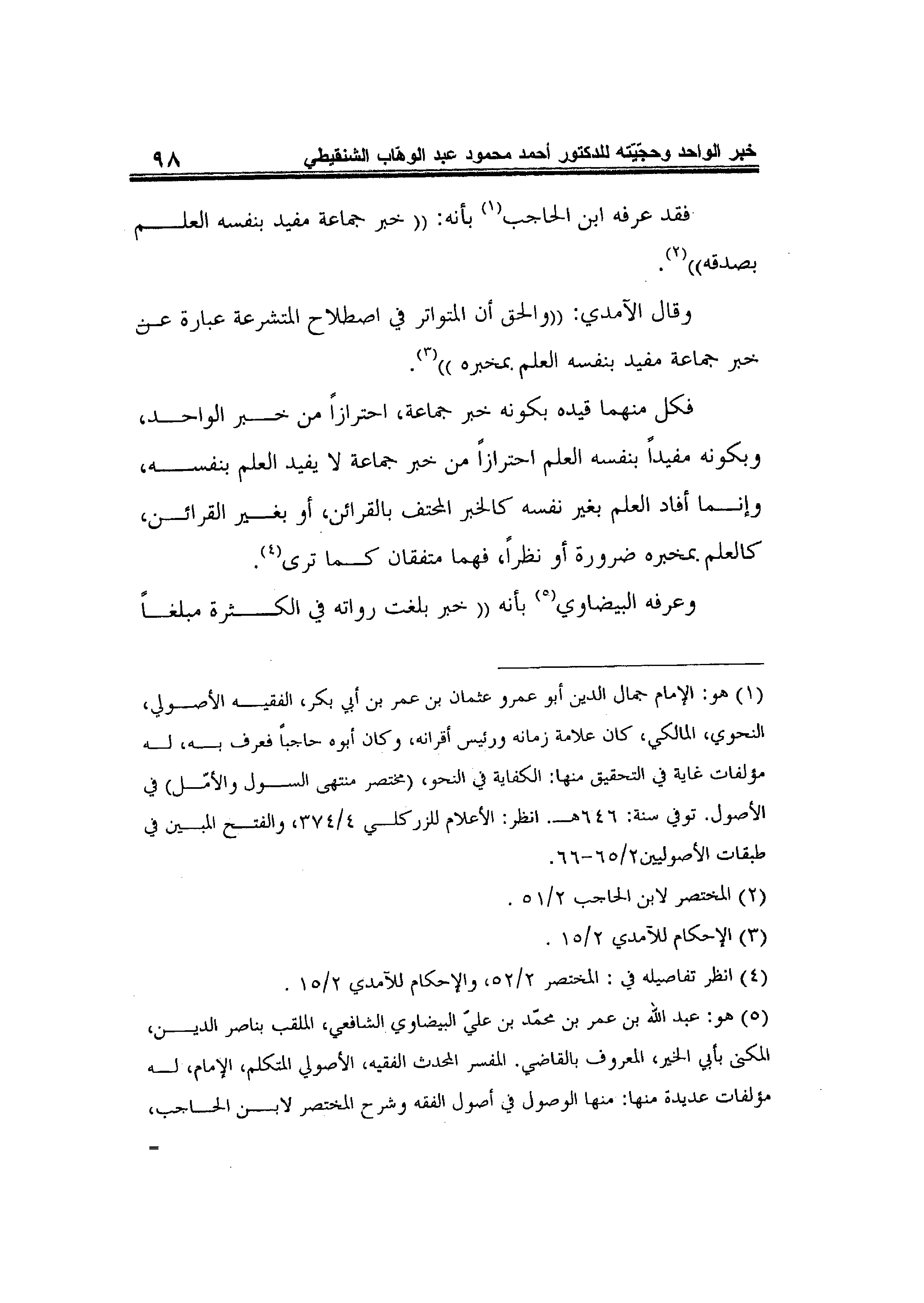 وقال الآمدي: "والحق أن المتواتر في اصطلاح المتشرعة عبارة عن خبر جماعة مفيد بنفسه العلم بمخبره"3.